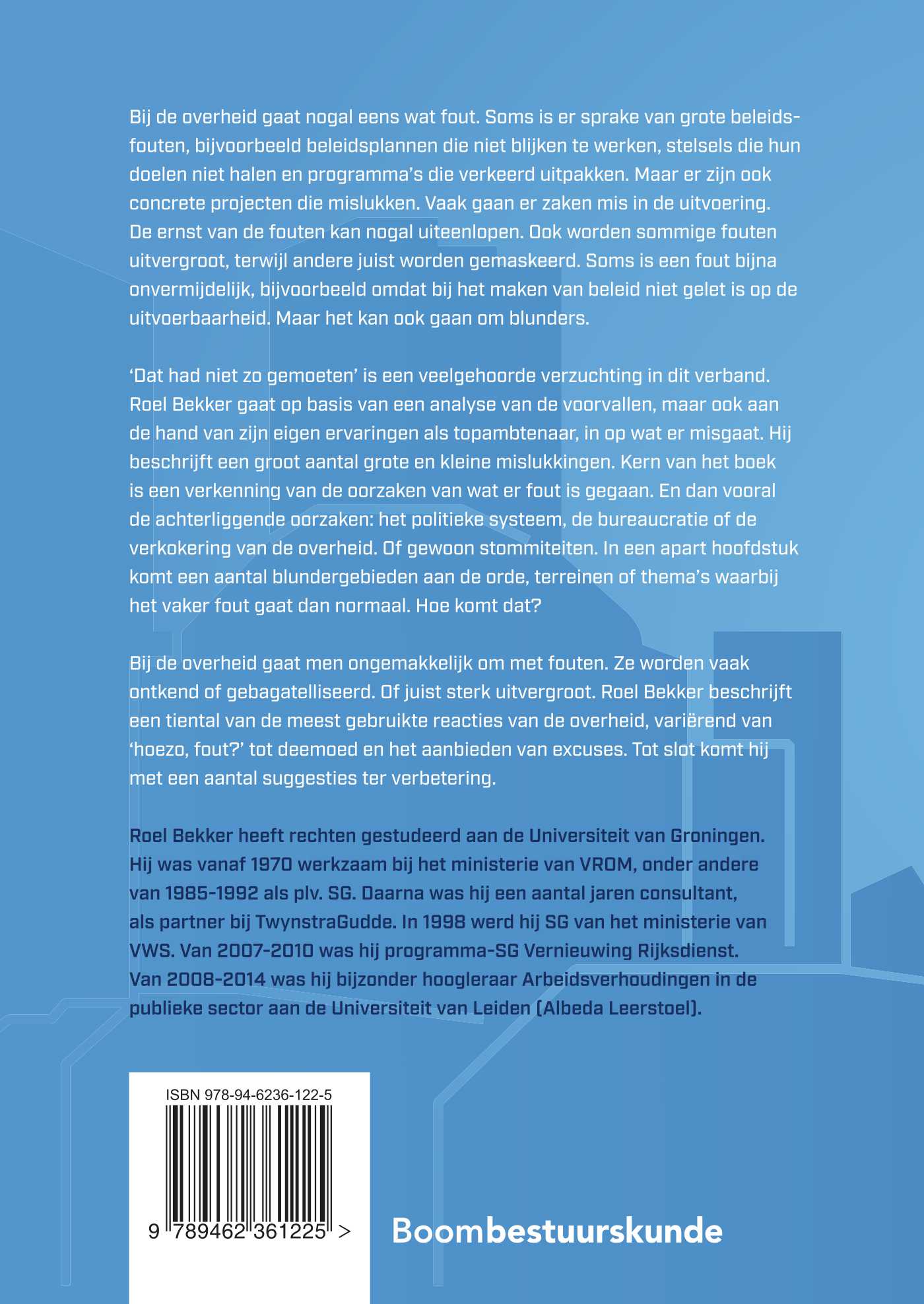 ‘Dat had niet zo gemoeten’ is een veelgehoorde verzuchting in dit verband. Roel Bekker gaat op basis van een analyse van de voorvallen, maar ook aan de hand van zijn eigen ervaringen als topambtenaar, in op wat er misgaat. Hij beschrijft een groot aantal grote en kleine mislukkingen. Kern van het boek is een verkenning van de oorzaken van wat er fout is gegaan. En dan vooral de achterliggende oorzaken: het politieke systeem, de bureaucratie of de verkokering van de overheid. Of gewoon stommiteiten. In een apart hoofdstuk komt een aantal blundergebieden aan de orde, terreinen of thema’s waarbij het vaker fout gaat dan normaal. Hoe komt dat?