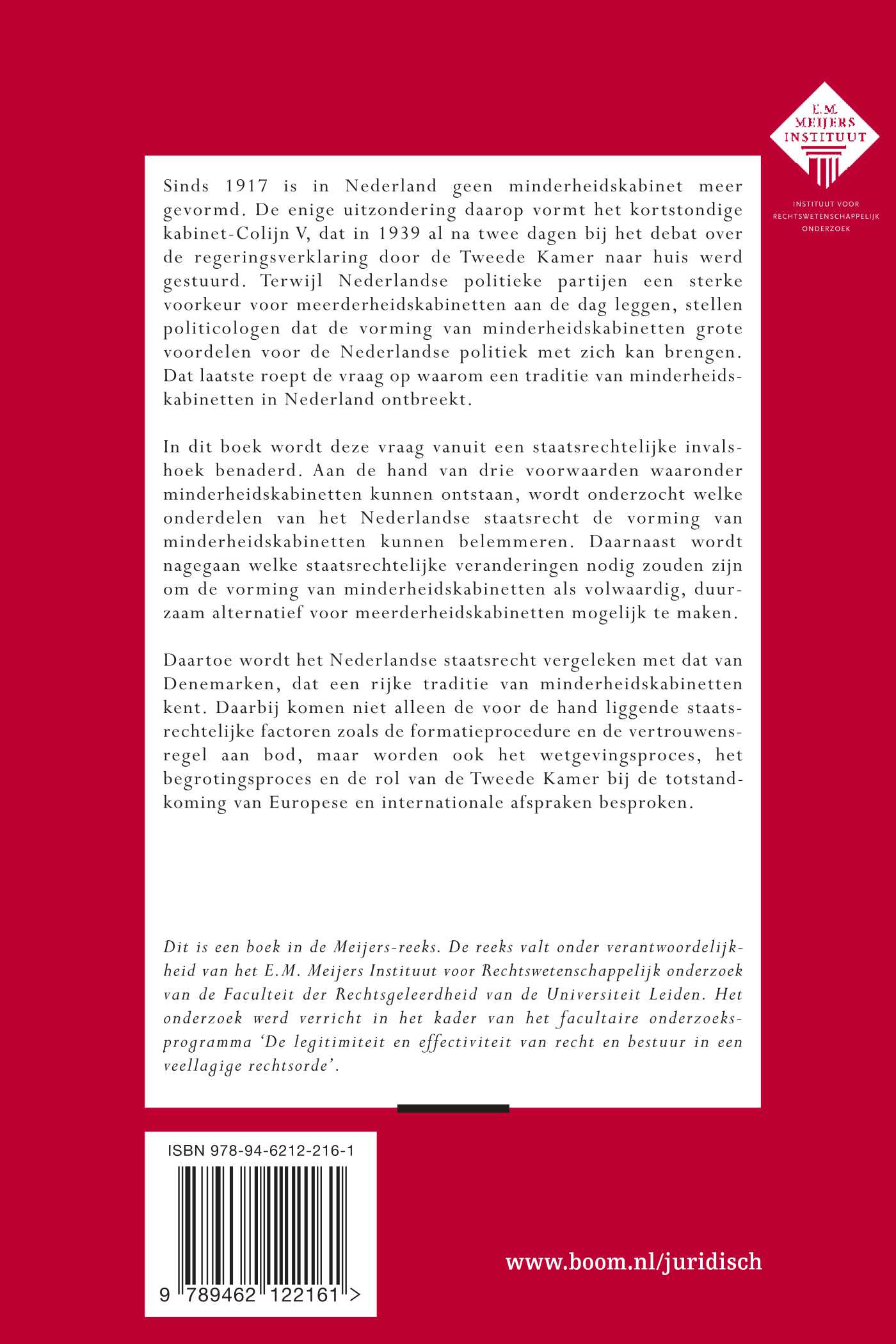 In dit boek wordt deze vraag vanuit een staatsrechtelijke invalshoek benaderd. Aan de hand van drie voorwaarden waaronder minderheidskabinetten kunnen ontstaan, wordt onderzocht welke onderdelen van het Nederlandse staatsrecht de vorming van minderheidskabinetten kunnen belemmeren. Daarnaast wordt nagegaan welke staatsrechtelijke veranderingen nodig zouden zijn om de vorming van minderheidskabinetten als volwaardig, duurzaam alternatief voor meerderheidskabinetten mogelijk te maken.