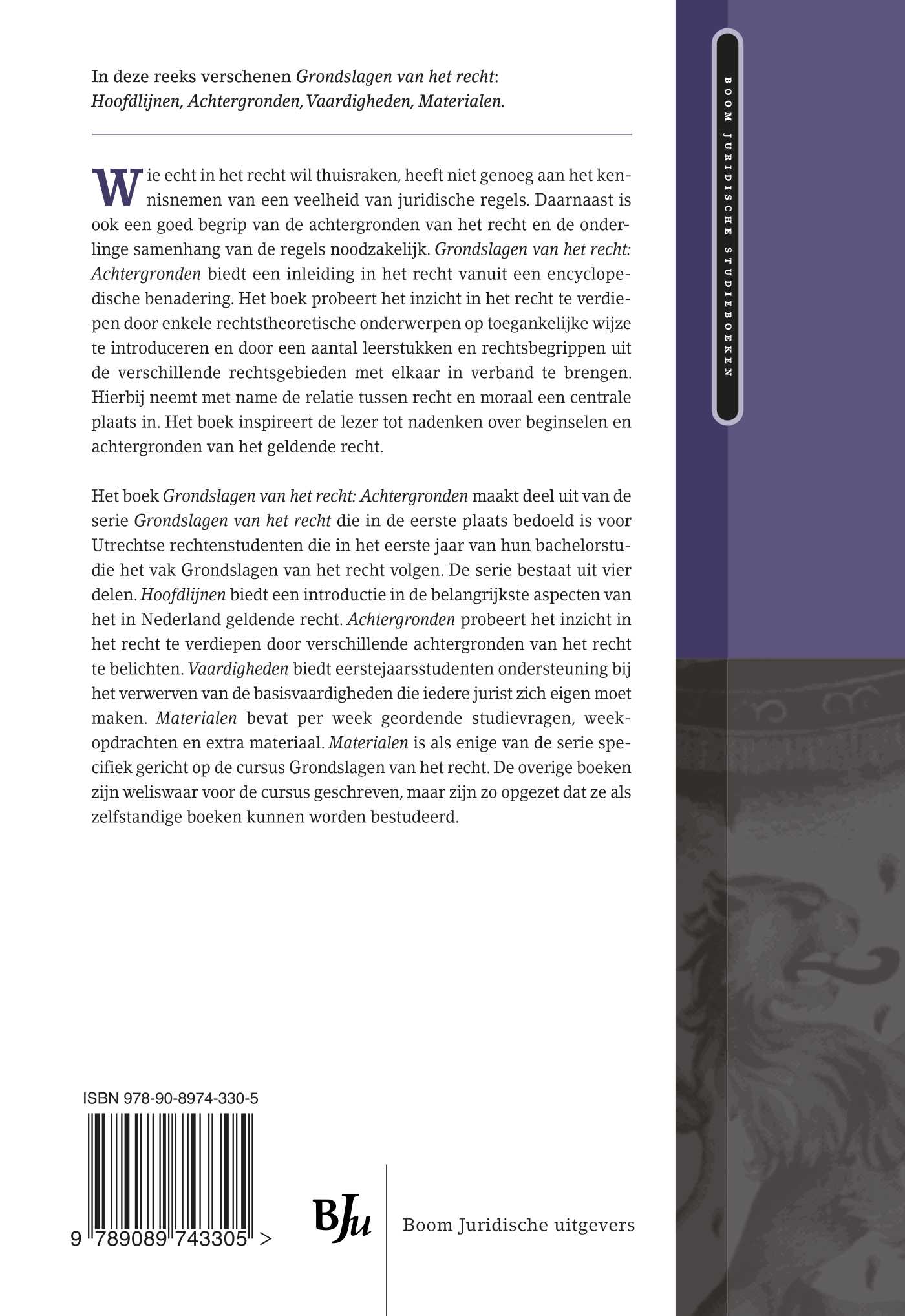 Hoofdlijnen biedt een introductie in de belangrijkste aspecten van het in Nederland geldende recht. Achtergronden probeert het inzicht in het recht te verdiepen door verschillende achtergronden van het recht te belichten. Vaardigheden biedt eerstejaarsstudenten ondersteuning bij het verwerven van de basisvaardigheden die iedere jurist zich eigen moet maken. Deze drie boeken zijn zo opgezet dat ze als zelfstandige boeken kunnen worden bestudeerd.