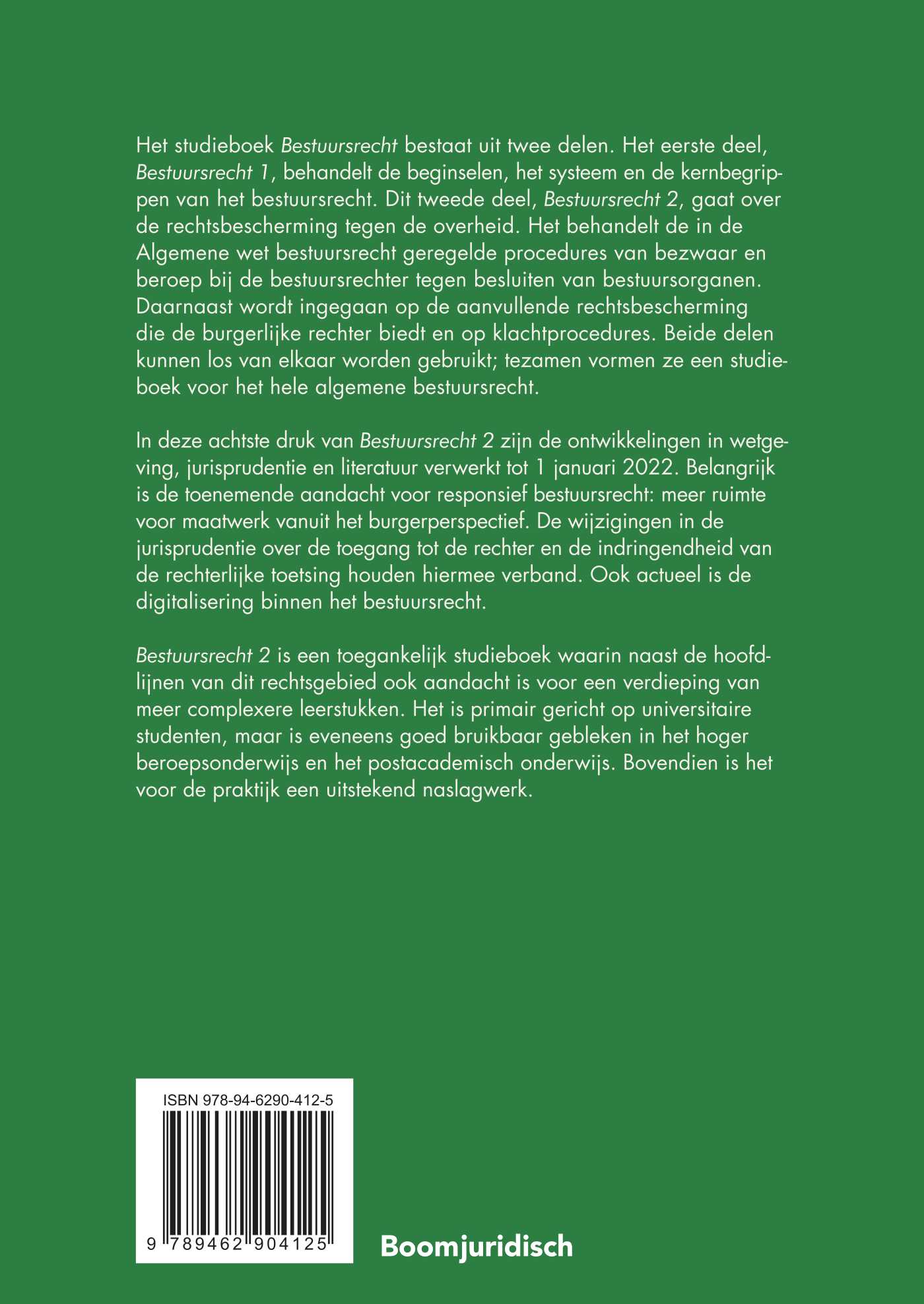 In deze achtste druk van Bestuursrecht 2 zijn de ontwikkelingen in wetgeving, jurisprudentie en literatuur verwerkt tot 1 januari 2022. Belangrijk is de toenemende aandacht voor responsief bestuursrecht: meer ruimte voor maatwerk vanuit het burgerperspectief. De wijzigingen in de jurisprudentie over de toegang tot de rechter en de indringendheid van de rechterlijke toetsing houden hiermee verband. Ook actueel is de digitalisering binnen het bestuursrecht. Bestuursrecht 2 is een toegankelijk studieboek waarin naast de hoofdlijnen van dit rechtsgebied ook aandacht is voor een verdieping van meer complexere leerstukken..