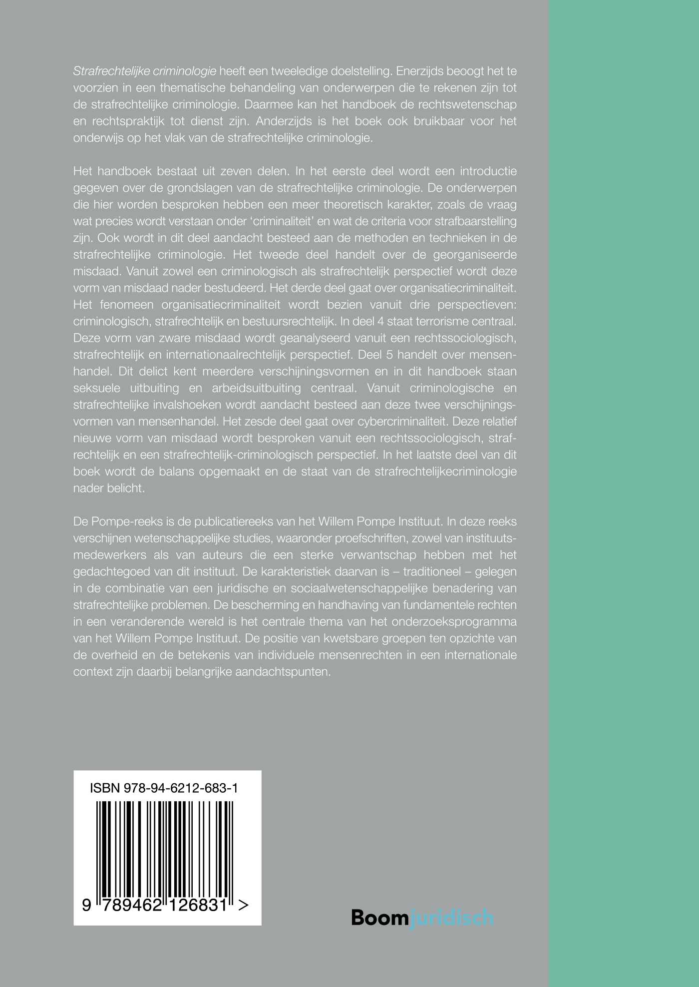 Dit boek handelt over de strafrechtelijke criminologie. Het heeft een tweeledige doelstelling. Enerzijds beoogt het te voorzien in een thematische behandeling van thema’s die te rekenen zijn tot de strafrechtelijke criminologie. Daarmee moet het handboek de rechtswetenschap en rechtspraktijk tot dienst kunnen zijn. Anderzijds moet het boek ook bruikbaar zijn voor het onderwijs op het vlak van de strafrechtelijke criminologie.
