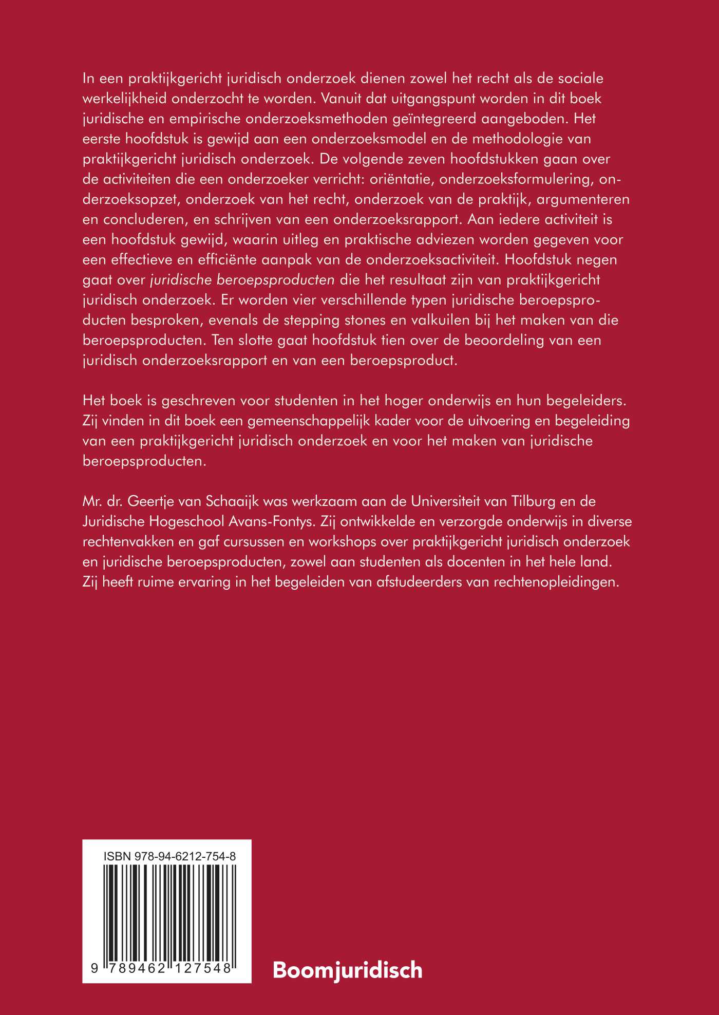 In een praktijkgericht juridisch onderzoek dienen zowel het recht als de sociale werkelijkheid onderzocht te worden. Dat is het uitgangspunt in dit boek en daarom worden juridische en empirische onderzoeksmethoden geïntegreerd aangeboden. Het eerste hoofdstuk is gewijd aan een onderzoeksmodel en de methodologie van praktijkgericht juridisch onderzoek. De volgende zeven hoofdstukken gaan over de activiteiten die een onderzoeker verricht: oriëntatie, onderzoeksformulering, onderzoeksopzet, onderzoek van het recht, onderzoek van de praktijk, argumenteren en concluderen, schrijven van een onderzoeksrapport. Aan iedere activiteit is een hoofdstuk gewijd, waarin een uitleg en praktische adviezen worden gegeven voor een effectieve en efficiënte aanpak van de onderzoeksactiviteit. Hoofdstuk negen gaat over juridische beroepsproducten die het resultaat zijn van praktijkgericht juridisch onderzoek. Vier verschillende typen juridische beroepsproducten worden besproken, evenals de stepping stones en valkuilen bij het maken van die beroepsproducten. Ten slotte gaat hoofdstuk tien over de beoordeling van een juridisch onderzoeksrapport en van een beroepsproduct.