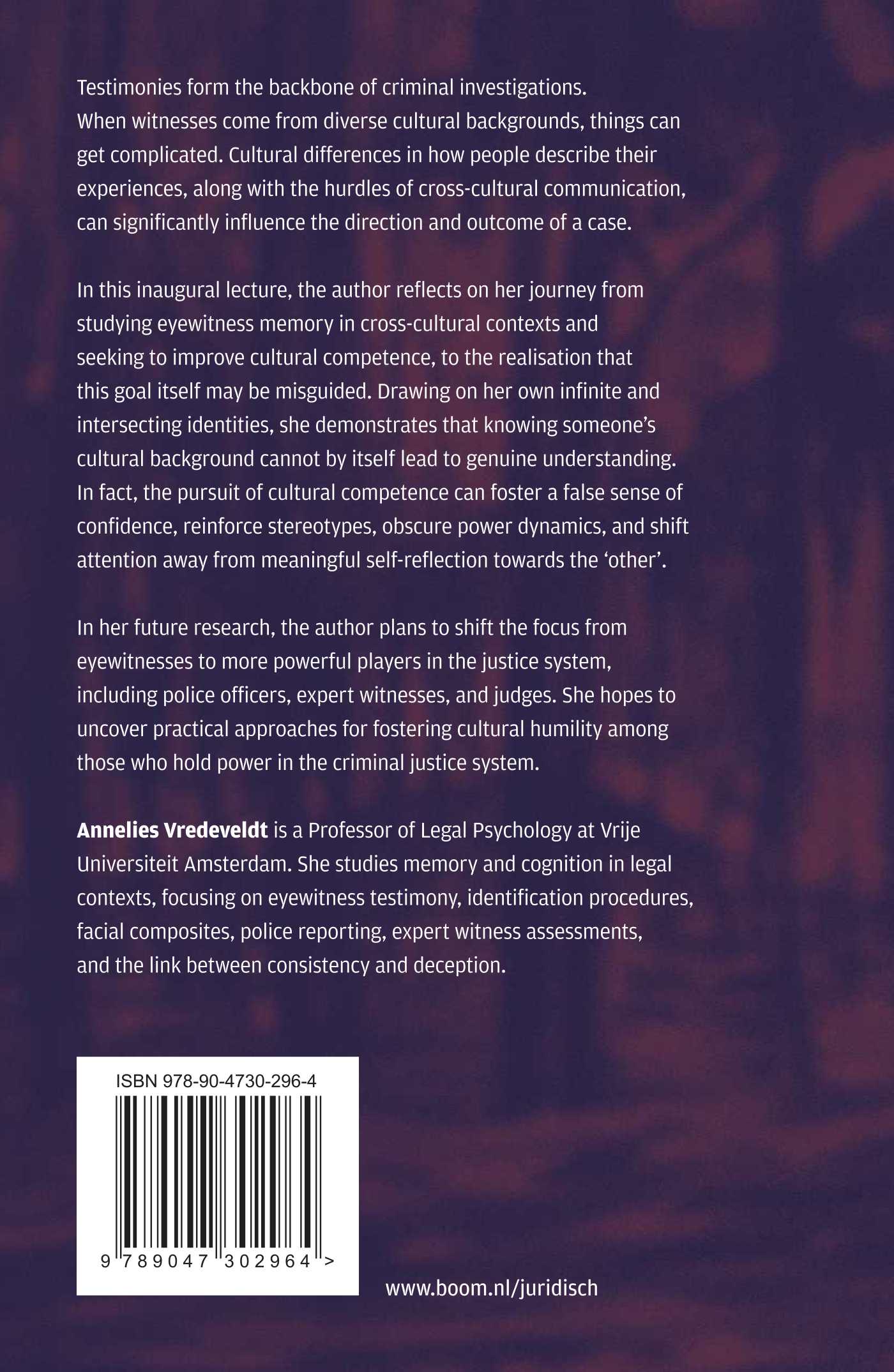 In this inaugural lecture, the author reflects on her journey from studying eyewitness memory in cross-cultural contexts and seeking to improve cultural competence, to the realisation that this goal itself may be misguided. Drawing on her own infinite and intersecting identities, she demonstrates that knowing someone’s cultural background cannot by itself lead to genuine understanding. In fact, the pursuit of cultural competence can foster a false sense of confidence, reinforce stereotypes, obscure power dynamics, and shift attention away from meaningful self-reflection towards the ‘other’.
