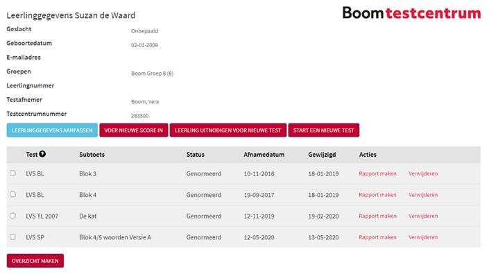 4. Je komt nu bij de leerlinggegevens van de leerling: hier staan alle genormeerde toetsen op datum;