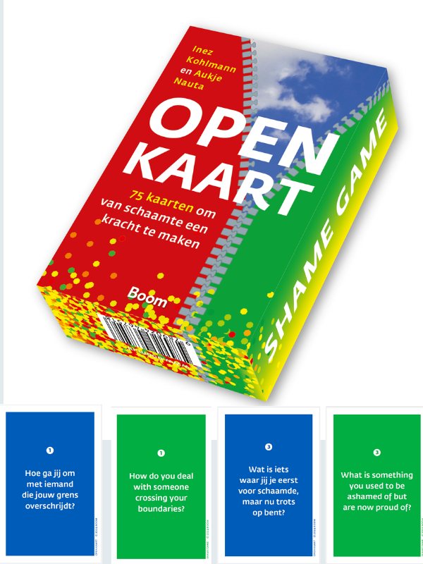 Met de de 75 schaamkaarten van Open kaart kun je schaamte op een lichtvoetige en ontwapenende manier onder ogen zien en samen bespreken. Gebruik de kaarten om je schaamte te overdenken en als krachtbron te benutten. In je eentje, of – en beter nog – samen met anderen. Dit spel leent zich uitstekend voor intervisiegroepen. Vraagstukken kunnen met extra diepgang worden besproken terwijl de sfeer desondanks luchtig blijft.