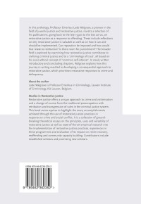 In this anthology, Professor Emeritus Lode Walgrave, a pioneer in the field of juvenile justice and restorative justice, revisits a selection of his publications, going back to the late 1990s to the late 2010s, on restorative justice as a response to offending. These include reflections on why restorative justice is valuable as well as on how it can and should be implemented. Can reparation be imposed and how would that relate to retribution? Is there room for punishment? The broader field is explored by examining how restorative justice contributes to civilising criminal justice and to a ‘criminology of trust’, all based on his socio-ethical concept of ‘common self-interest’. In newly written introductory and concluding chapters, Walgrave explains how this journey in writing resulted in developing a consequential approach to restorative justice, which prioritises restorative responses to crime and delinquency.
