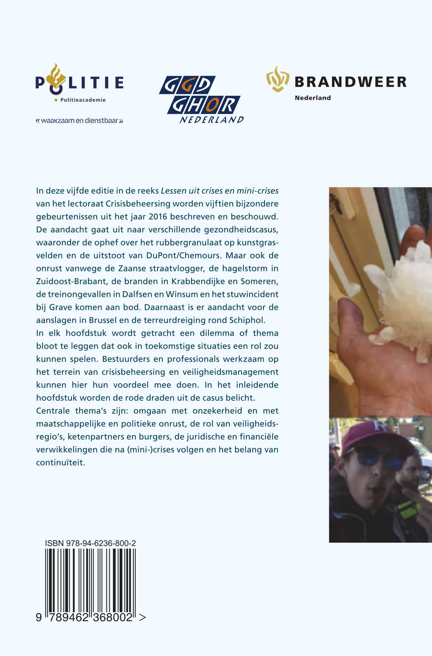 In deze vijfde editie in de reeks Lessen uit crises en mini-crises van het lectoraat Crisisbeheersing worden vijftien bijzondere gebeurtenissen uit het jaar 2016 beschreven en beschouwd. De aandacht gaat uit naar verschillende gezondheidscasus, waaronder de ophef over het rubbergranulaat op kunstgrasvelden en de uitstoot van DuPont/Chemours. Maar ook de onrust vanwege de Zaanse straatvlogger, de hagelstorm in Zuidoost-Brabant, de branden in Krabbendijke en Someren, de treinongevallen in Dalfsen en Winsum en het stuw incident bij Grave komen aan bod. Daarnaast is er aandacht voor de aanslagen in Brussel en de terreurdreiging rond Schiphol. In elk hoofdstuk wordt getracht een dilemma of thema bloot te leggen dat ook in toekomstige situaties een rol zou kunnen spelen. Bestuurders en professionals werkzaam op het terrein van crisisbeheersing en veiligheidsmanagement kunnen hier hun voordeel mee doen. In het inleidende hoofdstuk worden de rode draden uit de casus belicht. Centrale thema’s zijn: omgaan met onzekerheid en met maatschappelijke en politieke onrust, de rol van veiligheidsregio’s, ketenpartners en burgers, de juridische en financiële verwikkelingen die na (mini-)crises volgen en het belang van continuïteit.