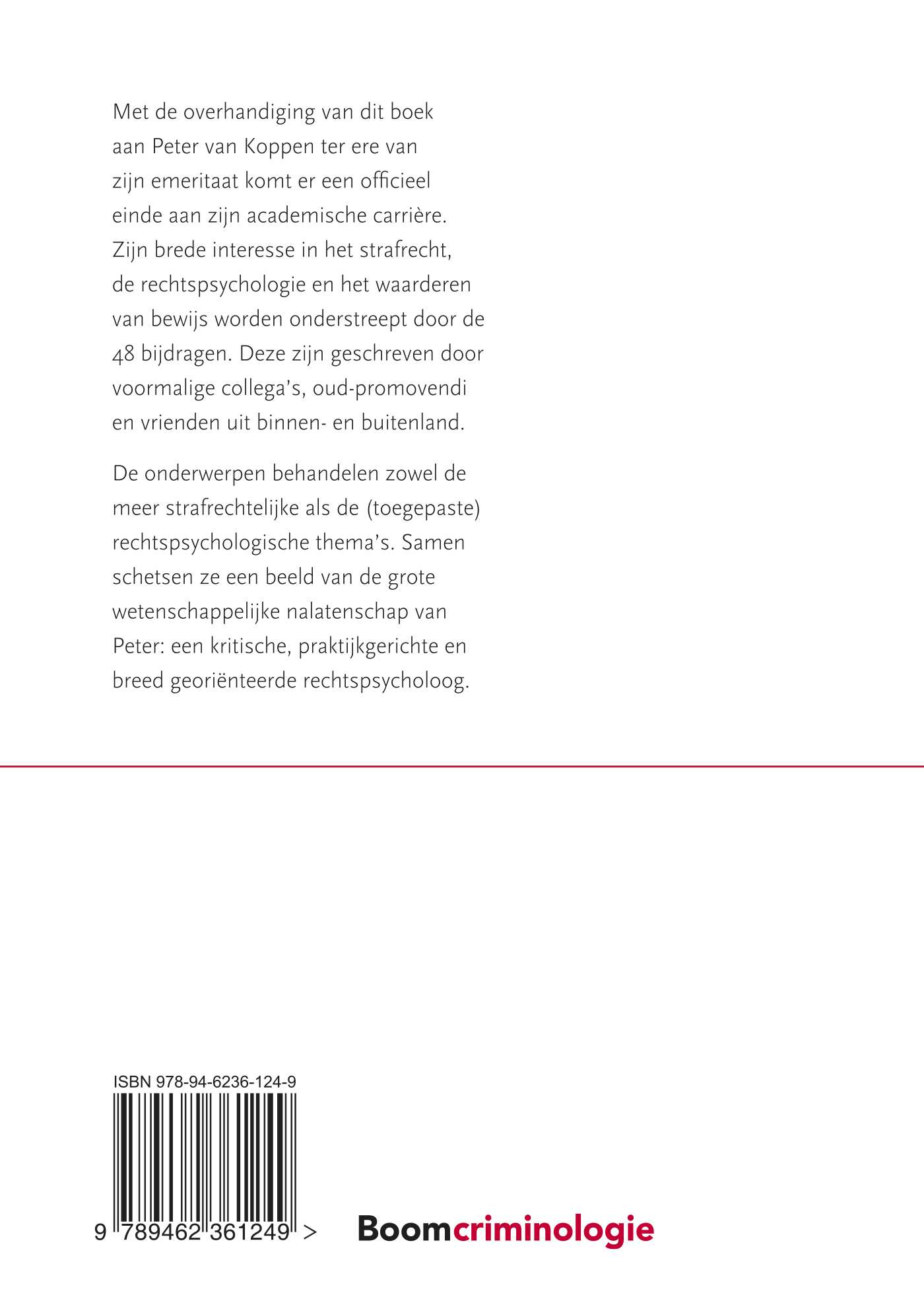 Met de overhandiging van dit boek aan Peter van Koppen ter ere van zijn emeritaat komt er een officieel einde aan zijn academische carrière. Zijn brede interesse in het strafrecht, de rechtspsychologie en het waarderen van bewijs worden onderstreept door de 48 bijdragen. Deze zijn geschreven door voormalige collega’s, oud-promovendi en vrienden uit binnen- en buitenland.