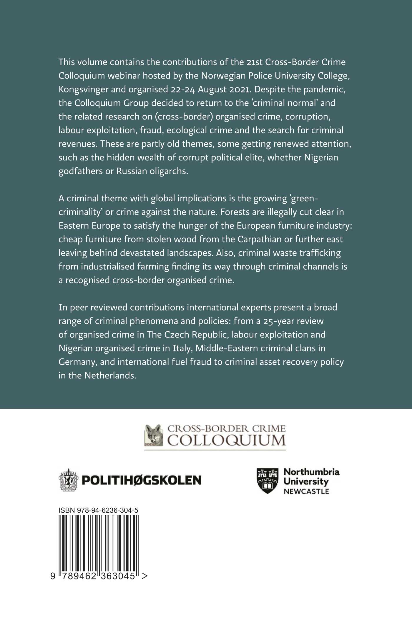 This volume contains the contributions of the 21st Cross-Border Crime Colloquium webinar hosted by the Norwegian Police University College, Kongsvinger and organised 22-24 August 2021. Despite the pandemic, the Colloquium Group decided to return to the ‘criminal normal’ and the related research on (cross-border) organised crime, corruption, labour exploitation, fraud, ecological crime and the search for criminal revenues. These are partly old themes, some getting renewed attention, such as the hidden wealth of corrupt political elite, whether Nigerian godfathers or Russian oligarchs.