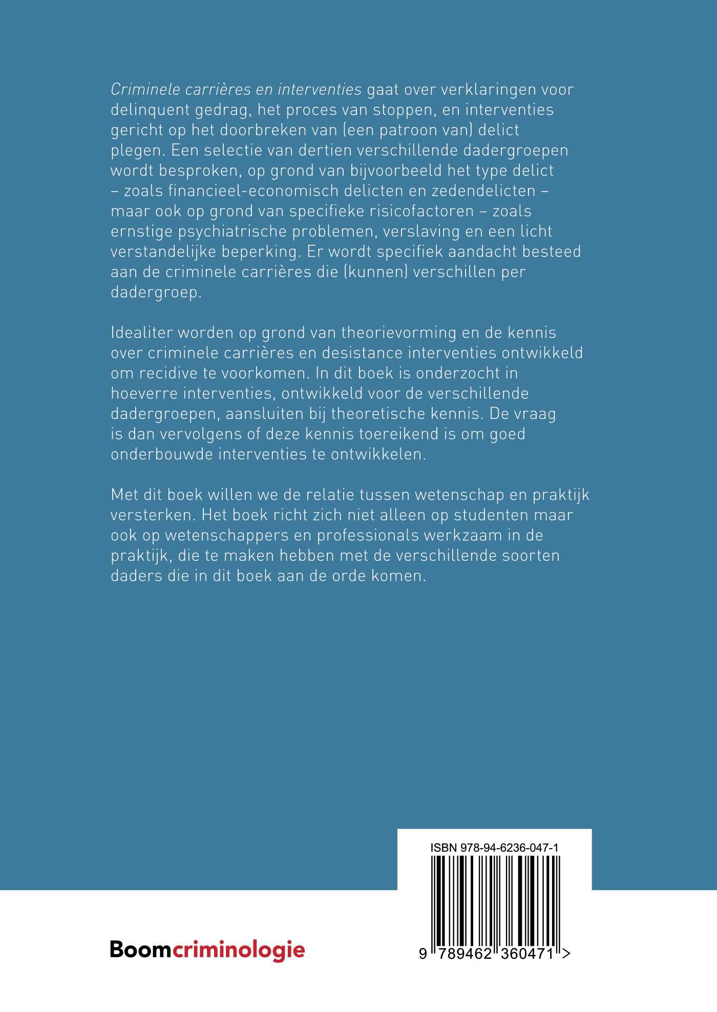 Criminele carrières en interventies gaat over verklaringen voor delinquent gedrag, het proces van stoppen, en interventies gericht op het doorbreken van (een patroon van) delict plegen. Een selectie van dertien verschillende dadergroepen wordt besproken, op grond van bijvoorbeeld het type delict – zoals financieel-economisch delicten en zedendelicten – maar ook op grond van specifieke risicofactoren – zoals ernstige psychiatrische problemen, verslaving en een licht verstandelijke beperking. Er wordt specifiek aandacht besteed aan de criminele carrières die (kunnen) verschillen per dadergroep.