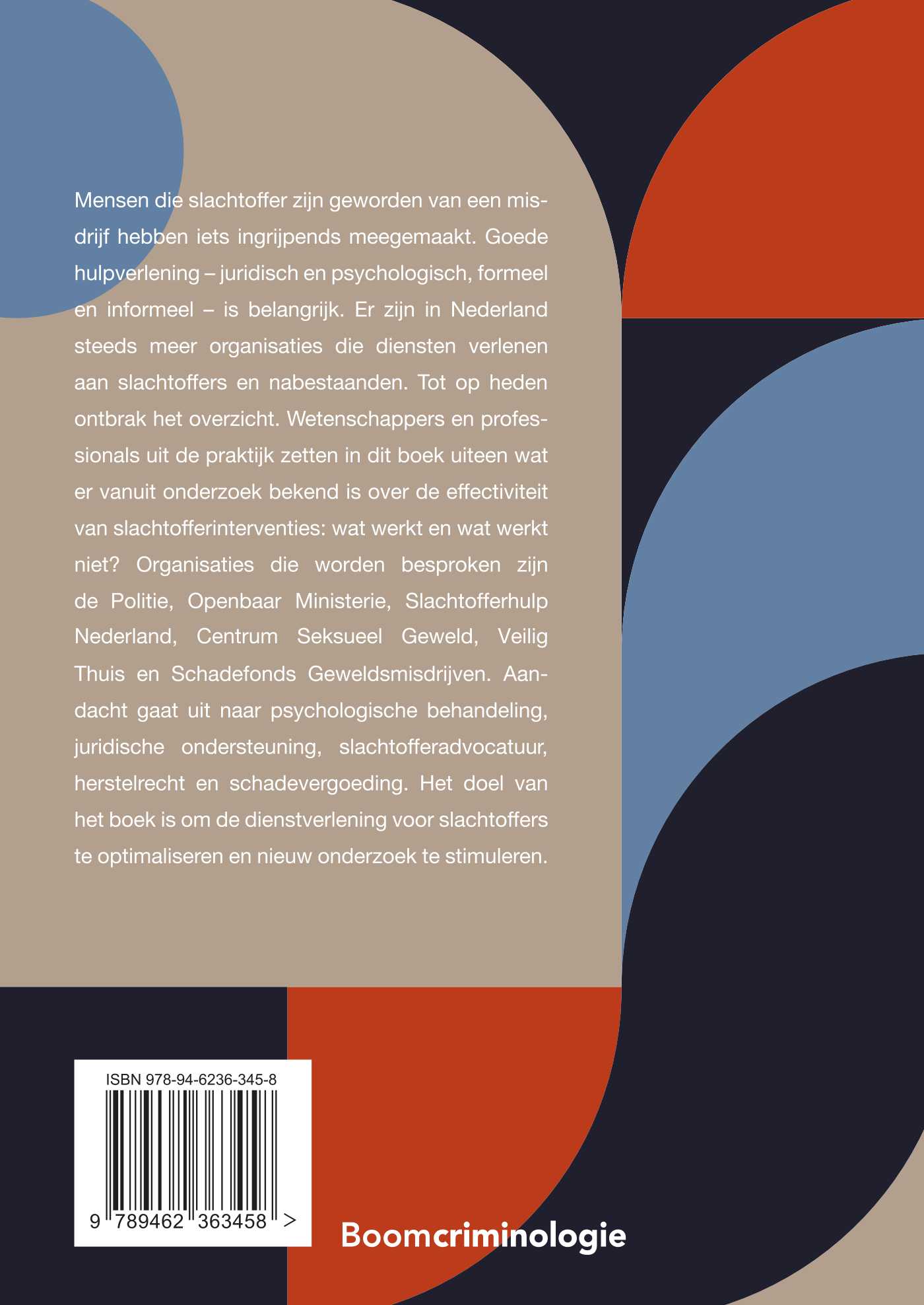 Tot op heden ontbrak het overzicht. Wetenschappers en professionals uit de praktijk zetten in dit boek uiteen wat er vanuit onderzoek bekend is over de effectiviteit van slachtofferinterventies: wat werkt en wat werkt niet? Organisaties die worden besproken zijn de Politie, Openbaar Ministerie, Slachtofferhulp Nederland, Centrum Seksueel Geweld, Veilig Thuis en Schadefonds Geweldsmisdrijven. Aandacht gaat uit naar psychologische behandeling, juridische ondersteuning, slachtofferadvocatuur, herstelrecht en schadevergoeding. Het doel van het boek is om de dienstverlening voor slachtoffers te optimaliseren en nieuw onderzoek te stimuleren.