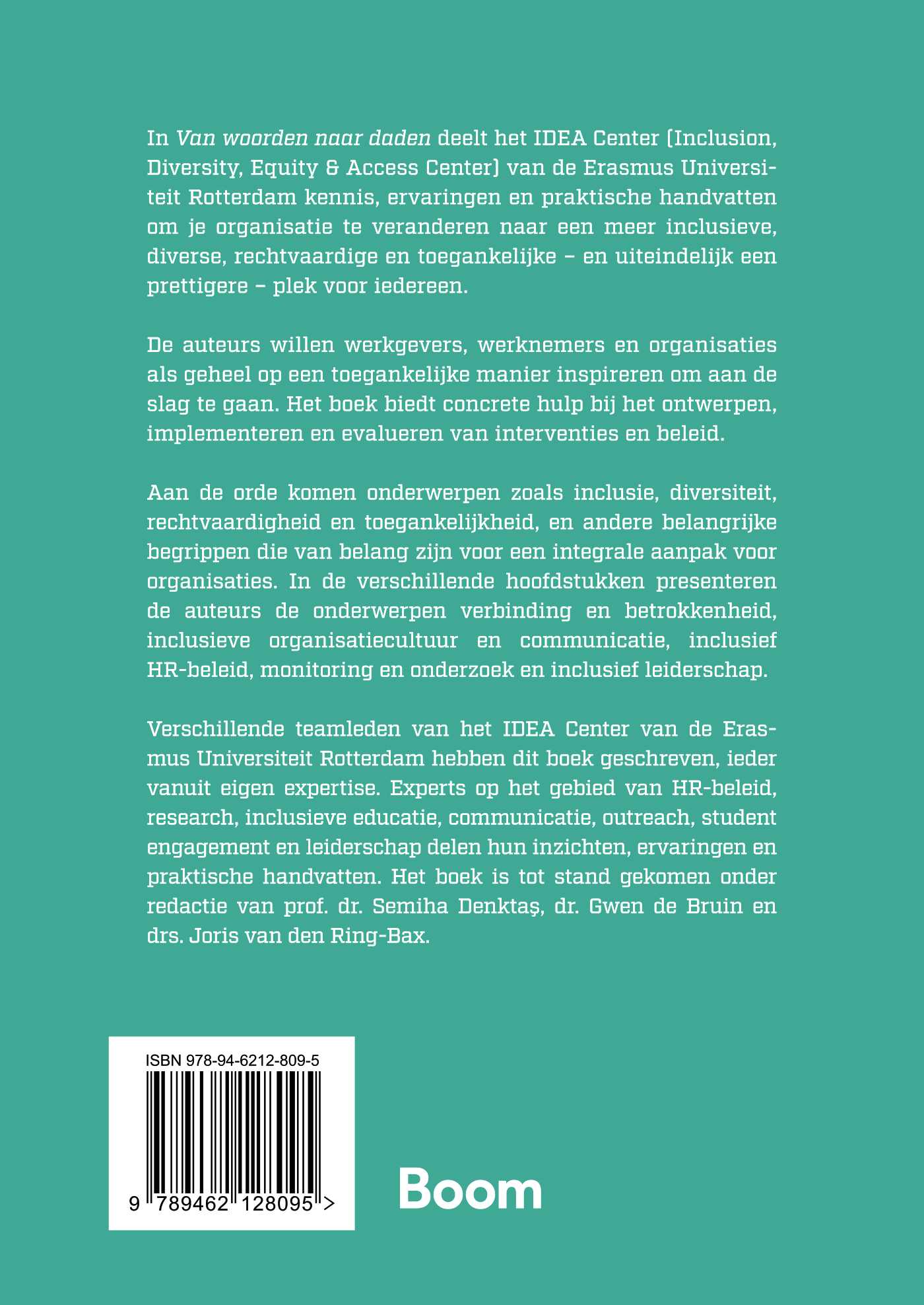 Verschillende teamleden van het IDEA Center van de Erasmus Universiteit Rotterdam hebben dit boek geschreven, ieder vanuit eigen expertise. Experts op het gebied van HR-beleid, research, inclusieve educatie, communicatie, outreach, student engagement en leiderschap delen hun inzichten, ervaringen en praktische handvatten. Het boek is tot stand gekomen onder redactie van prof. dr. Semiha Denktaş, dr. Gwen de Bruin en drs. Joris van den Ring-Bax.