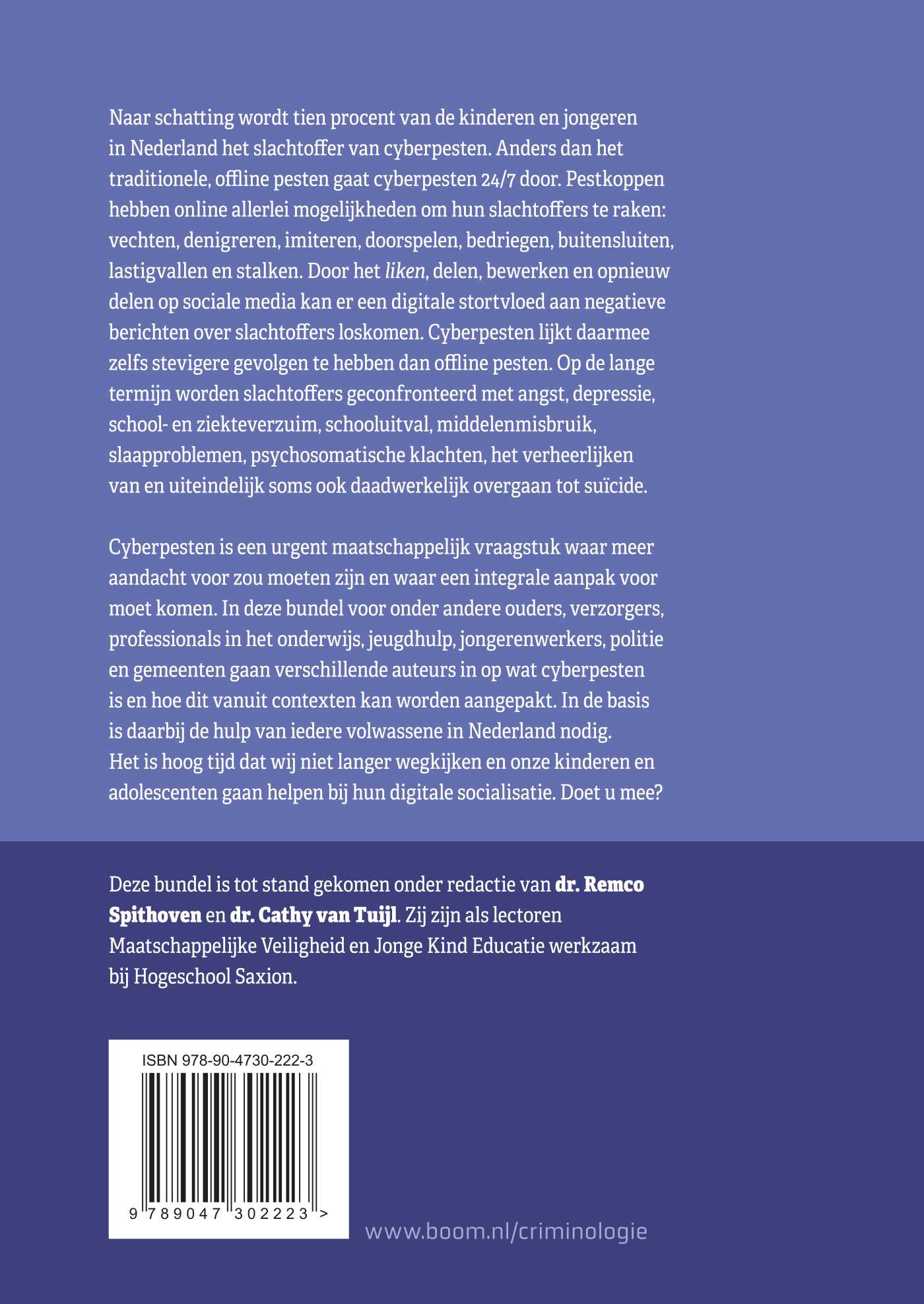 Cyberpesten is een urgent maatschappelijk vraagstuk waar meer aandacht voor zou moeten zijn en een integrale aanpak op moet worden gericht. In deze bundel voor o.a. ouders, verzorgers, professionals in het onderwijs, de jeugdhulp, jongerenwerk, politie en gemeenten gaan verschillende auteurs in op wat cyberpesten is en hoe dit in vanuit contexten kan worden aangepakt. In de basis is daarbij de hulp van iedere volwassene in Nederland nodig. Het is hoog tijd dat wij niet langer wegkijken en onze kinderen en adolescenten gaan helpen bij hun digitale socialisatie. Doet u mee?