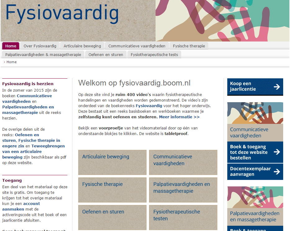 Op de website fysiovaardig.boom.nl vind je ruim 400 video’s waarin fysiotherapeutische handelingen en vaardigheden worden gedemonstreerd. De video's zijn onderdeel van de boekenreeks Fysiovaardig voor het hoger onderwijs. Naast het videomateriaal zijn de boeken Oefenen en sturen, Fysische therapie in engere zin en Teweegbrengen van een articulaire beweging opgenomen op de website.
