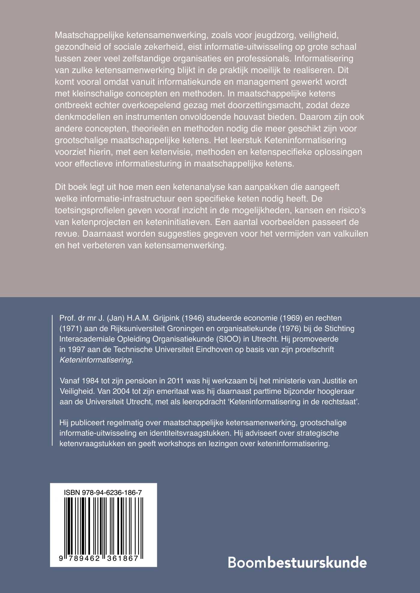 Maatschappelijke ketensamenwerking, zoals voor jeugdzorg, veiligheid, gezondheid of sociale zekerheid, eist informatie-uitwisseling op grote schaal tussen zeer veel zelfstandige organisaties en professionals. Informatisering van zulke ketensamenwerking blijkt in de praktijk moeilijk te realiseren. Dit komt vooral omdat vanuit informatiekunde en management gewerkt wordt met kleinschalige concepten en methoden. In maatschappelijke ketens ontbreekt echter overkoepelend gezag met doorzettingsmacht, zodat deze denkmodellen en instrumenten onvoldoende houvast bieden. Daarom zijn ook andere concepten, theorieën en methoden nodig die meer geschikt zijn voor grootschalige maatschappelijke ketens. Het leerstuk Keteninformatisering voorziet hierin, met een ketenvisie, methoden en ketenspecifieke oplossingen voor effectieve informatiesturing in maatschappelijke ketens.