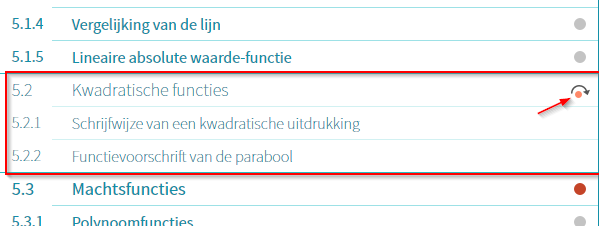 Onder de knop 'Voortgang' staan je studieresultaten van je actieve klas. Wil je meer details zien dan klik je op de cursus, vervolgens zie je je resultaten van de cursus. In het totaaloverzicht kun je klikken op een bolletje om door te linken naar alle resultaten van de betreffende cursus.