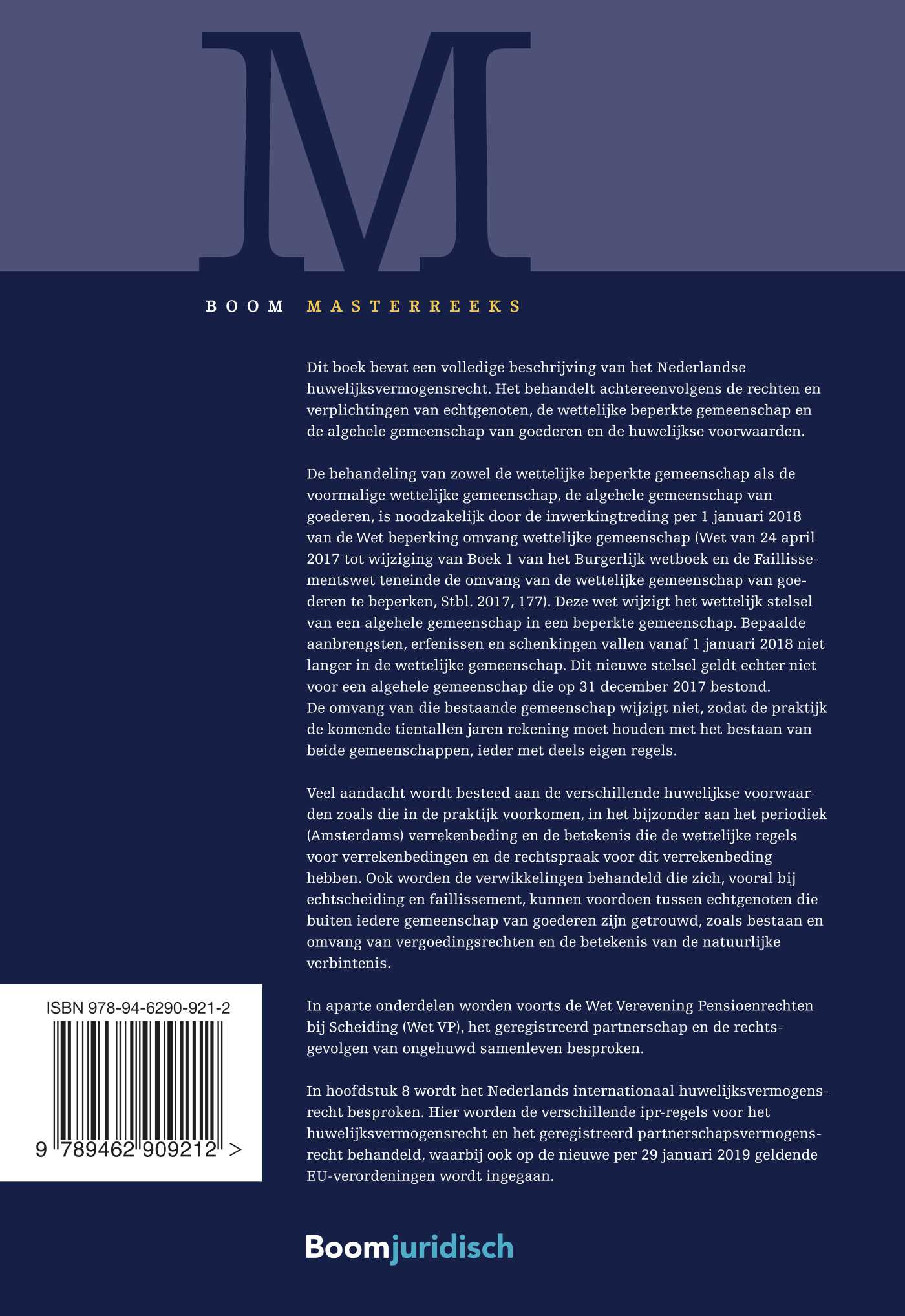 Dit boek bevat een volledige beschrijving van het Nederlandse huwelijksvermogensrecht. Het behandelt achtereenvolgens de rechten en verplichtingen van echtgenoten, de wettelijke beperkte gemeenschap en de algehele gemeenschap van goederen en de huwelijkse voorwaarden.