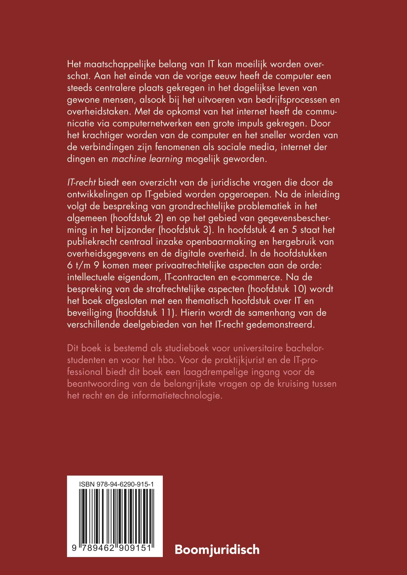 IT-recht biedt een overzicht van de juridische vragen die door de ontwikkelingen op IT-gebied worden opgeroepen. Na de inleiding volgt de bespreking van grondrechtelijke problematiek in het algemeen (hoofdstuk 2) en op het gebied van gegevensbescherming in het bijzonder (hoofdstuk 3). In hoofdstuk 4 en 5 staat het publiekrecht centraal inzake openbaarmaking en hergebruik van overheidsgegevens en de digitale overheid. In de hoofdstukken 6 t/m 9 komen meer privaatrechtelijke aspecten aan de orde: intellectuele eigendom, IT-contracten en e-commerce. Na de bespreking van de strafrechtelijke aspecten (hoofdstuk 10) wordt het boek afgesloten met een thematisch hoofdstuk over IT en beveiliging (hoofdstuk 11). Hierin wordt de samenhang van de verschillende deelgebieden van het IT-recht gedemonstreerd.
