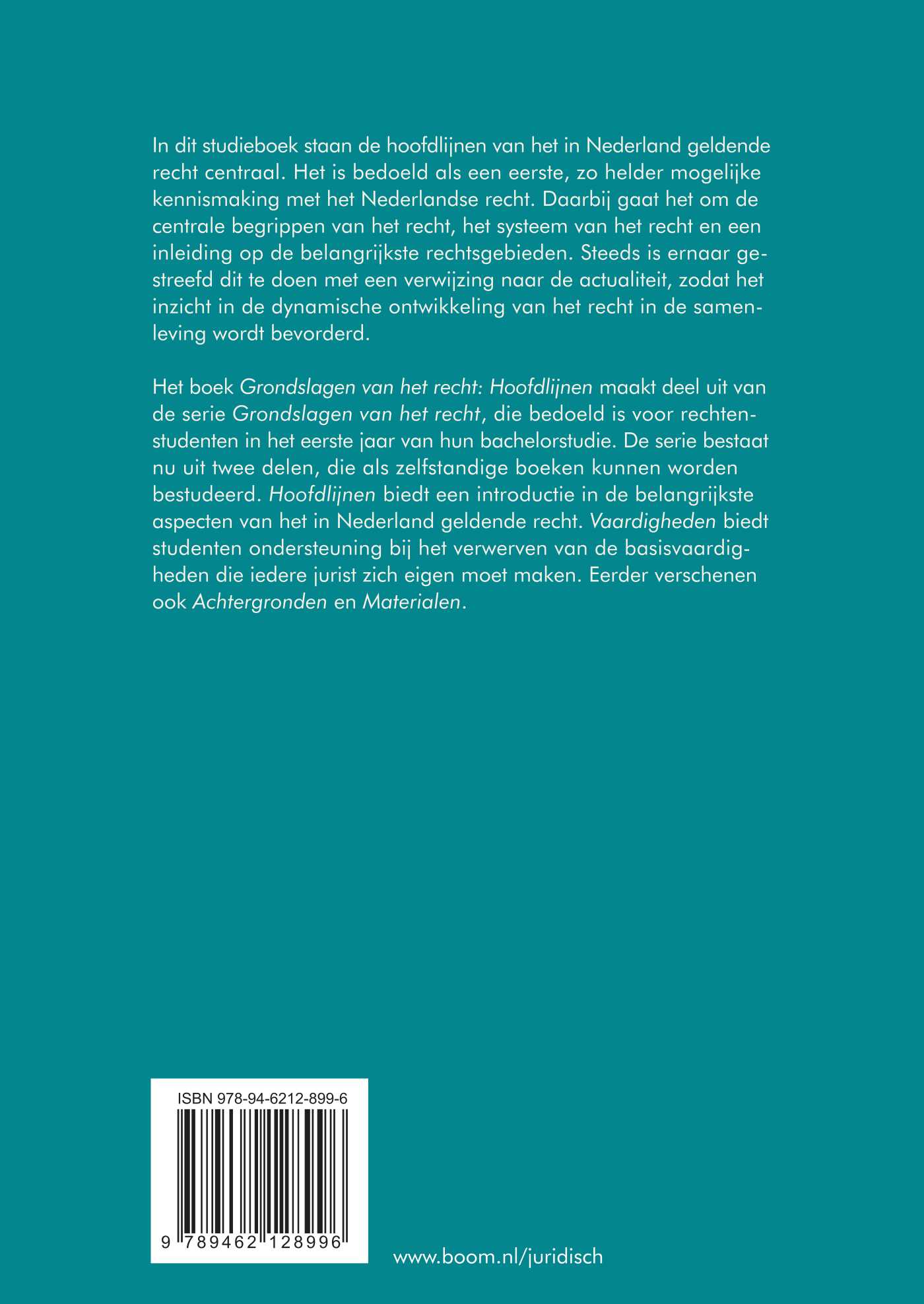 Het boek Grondslagen van het recht: Hoofdlijnen maakt deel uit van de serie Grondslagen van het recht, die bedoeld is voor rechtenstudenten in het eerste jaar van hun bachelorstudie. De serie bestaat nu uit twee delen, die als zelfstandige boeken kunnen worden bestudeerd. Hoofdlijnen biedt een introductie in de belangrijkste aspecten van het in Nederland geldende recht. Vaardigheden biedt studenten ondersteuning bij het verwerven van de basisvaardigheden die iedere jurist zich eigen moet maken. Eerder verschenen ook Achtergronden en Materialen.