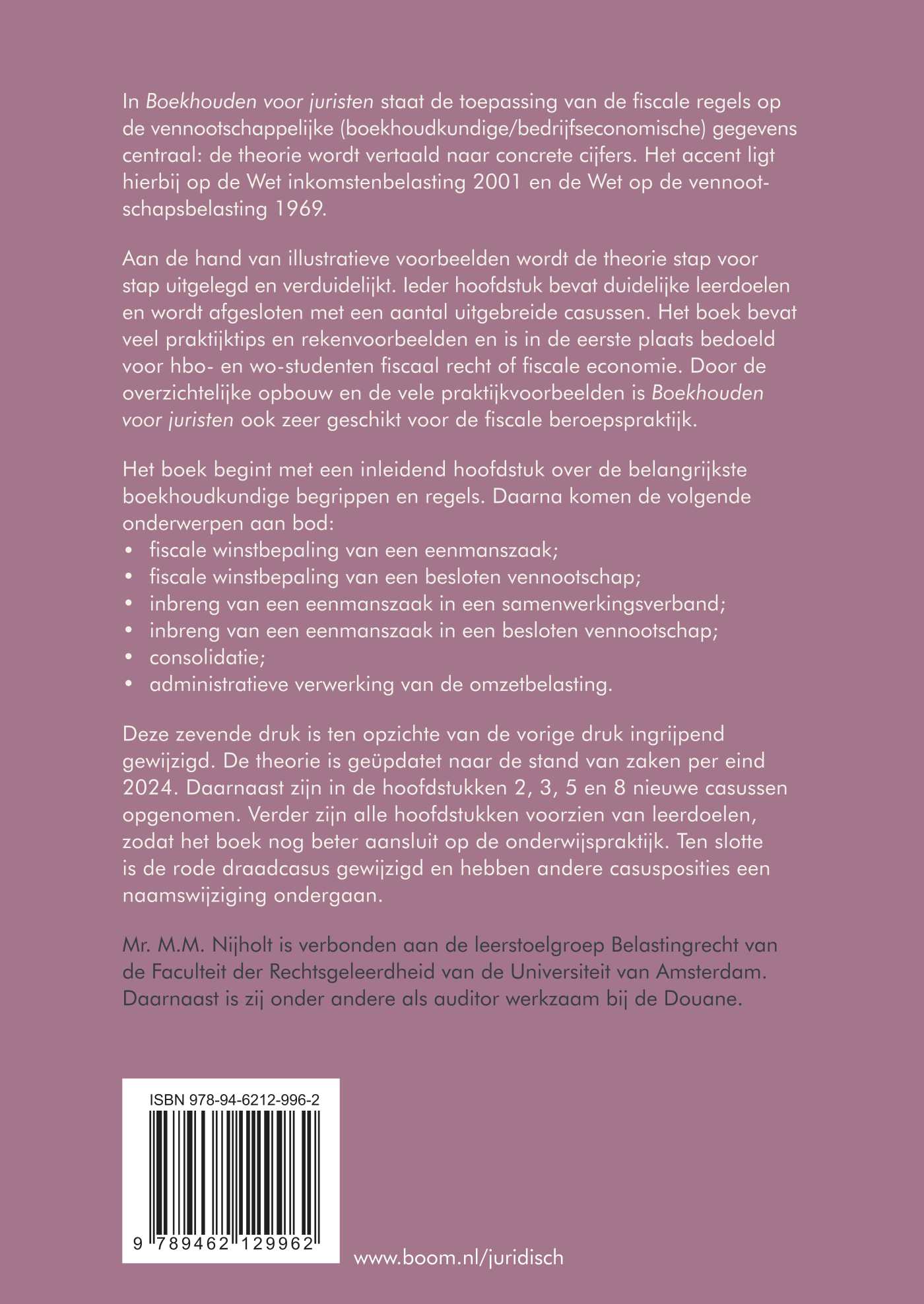Deze zevende druk is ten opzichte van de vorige druk ingrijpend gewijzigd. De theorie is geüpdatet naar de stand van zaken per eind 2024. Daarnaast zijn in de hoofdstukken 2, 3, 5 en 8 nieuwe casussen opgenomen. Verder zijn alle hoofdstukken voorzien van leerdoelen, zodat het boek nog beter aansluit op de onderwijspraktijk. Ten slotte is de rode draadcasus gewijzigd en hebben andere casusposities een naamswijziging ondergaan.