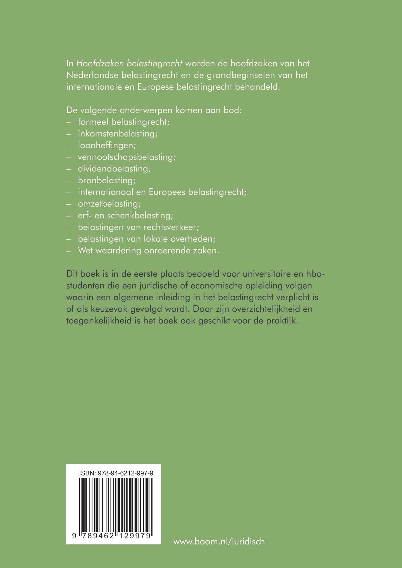 Dit boek is in de eerste plaats bedoeld voor universitaire en hbo-studenten die een juridische of economische opleiding volgen waarin een algemene inleiding in het belastingrecht verplicht is of als keuzevak gevolgd wordt.