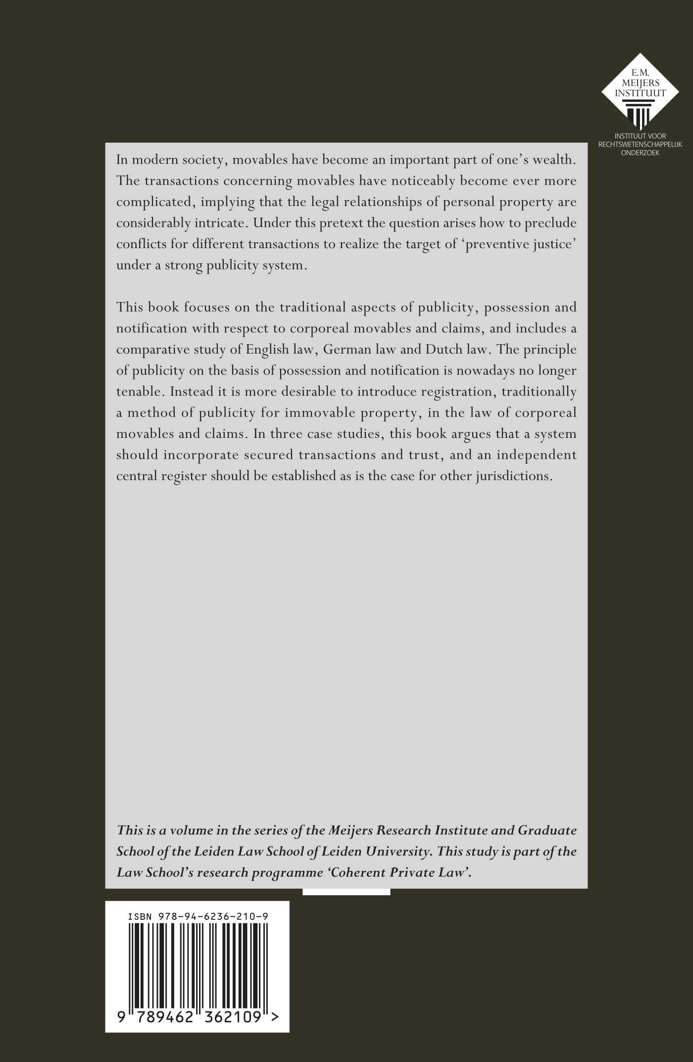 This book focuses on the traditional aspects of publicity, possession and notification with respect to corporeal movables and claims, and includes a comparative study of English law, German law and Dutch law. The principle of publicity on the basis of possession and notification is nowadays no longer tenable. Instead it is more desirable to introduce registration, traditionally a method of publicity for immovable property, in the law of corporeal movables and claims. In three case studies, this book argues that a system should incorporate secured transactions and trust, and an independent central register should be established as is the case for other jurisdictions.