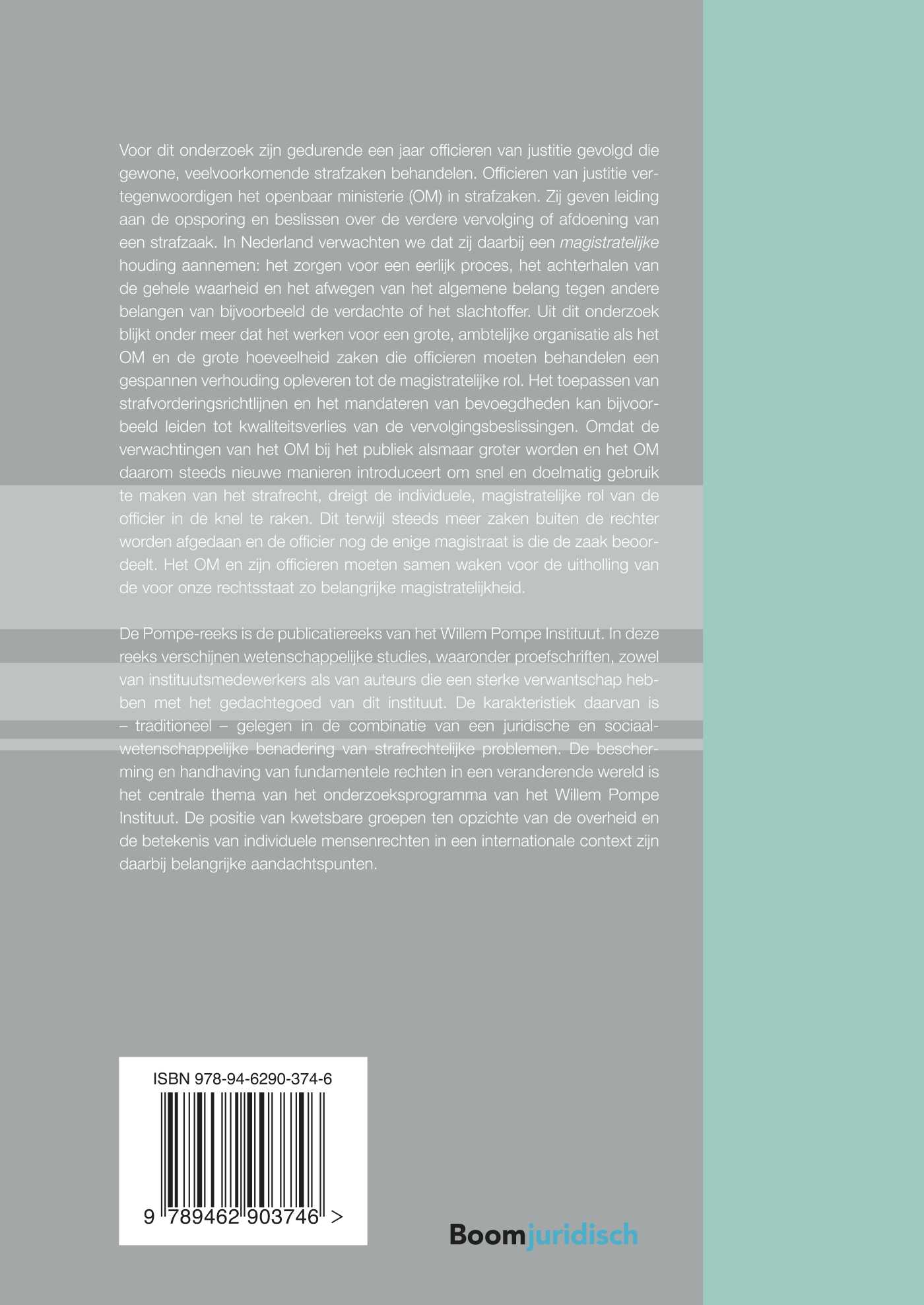 Voor dit onderzoek zijn gedurende een jaar officieren van justitie gevolgd die gewone, veelvoorkomende strafzaken doen. Officieren van justitie vertegenwoordigen het openbaar ministerie (OM) in strafzaken. Zij geven leiding aan de opsporing en beslissen over de verdere vervolging of afdoening van een strafzaak. In Nederland verwachten we dat zij daarbij een magistratelijke houding aannemen: zorgen voor een eerlijk proces, het achterhalen van de gehele waarheid en het afwegen van het algemene belang tegen andere belangen van bijvoorbeeld de verdachte of het slachtoffer. Uit dit onderzoek blijkt dat het werken voor een grote, ambtelijke organisatie als het OM en de grote hoeveelheid zaken die officieren moeten behandelen een gespannen verhouding opleveren tot de magistratelijke rol. Het toepassen van strafvorderingsrichtlijnen en het mandateren van bevoegdheden kan bijvoorbeeld leiden tot kwaliteitsverlies van de vervolgingsbeslissingen. Omdat de verwachtingen van het OM bij het publiek steeds groter worden en de leiding van het OM daarom steeds nieuwe manieren introduceert om snel, zichtbaar en betekenisvol gebruik te maken van het strafrecht, dreigt de individuele, magistratelijke rol van de officier in de knel te raken. Dit terwijl steeds meer zaken buiten de rechter worden afgedaan en de officier nog de enige magistraat is die de zaak beoordeelt. Het OM en zijn officieren moeten samen waken voor de uitholling van de voor onze rechtsstaat zo belangrijke magistratelijkheid.