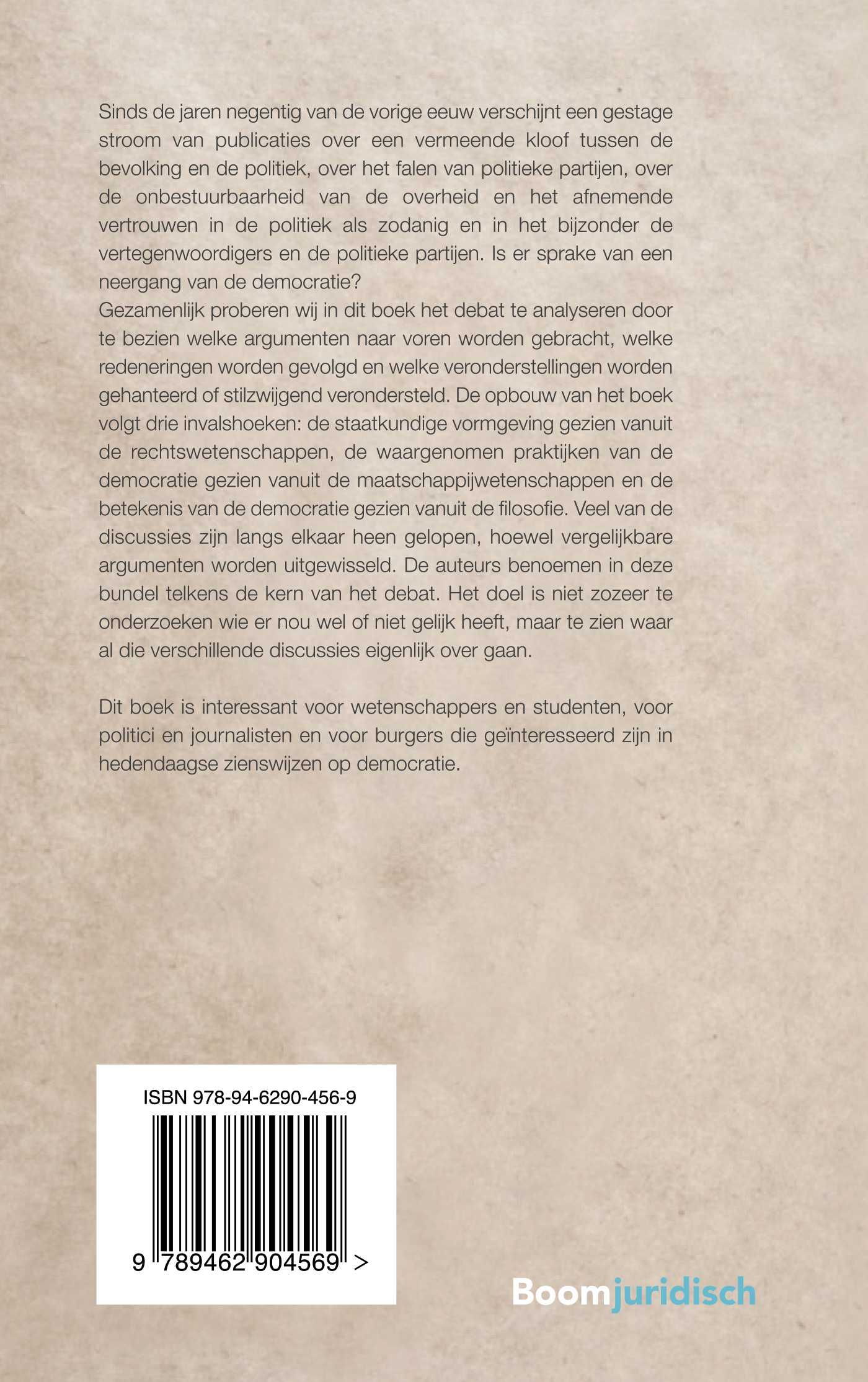 Sinds de jaren negentig van de vorige eeuw verschijnt een gestage stroom van publicaties over een vermeende kloof tussen de bevolking en de politiek, over het falen van politieke partijen, over de onbestuurbaarheid van de overheid en het afnemende vertrouwen in de politiek als zodanig en in het bijzonder de vertegenwoordigers en de politieke partijen. Is er sprake van een neergang van de democratie? Gezamenlijk proberen wij in dit boek het debat te analyseren door te bezien welke argumenten naar voren worden gebracht, welke redeneringen worden gevolgd en welke veronderstellingen worden gehanteerd of stilzwijgend verondersteld. De opbouw van het boek volgt drie invalshoeken: de staatkundige vormgeving gezien vanuit de rechtswetenschappen, de waargenomen praktijken van de democratie gezien vanuit de maatschappijwetenschappen en de betekenis van de democratie gezien vanuit de filosofie. Veel van de discussies zijn langs elkaar heen gelopen, hoewel vergelijkbare argumenten worden uitgewisseld. De auteurs benoemen in deze bundel telkens de kern van het debat. Het doel is niet zozeer te onderzoeken wie er nou wel of niet gelijk heeft, maar te zien waar al die verschillende discussies eigenlijk over gaan.
