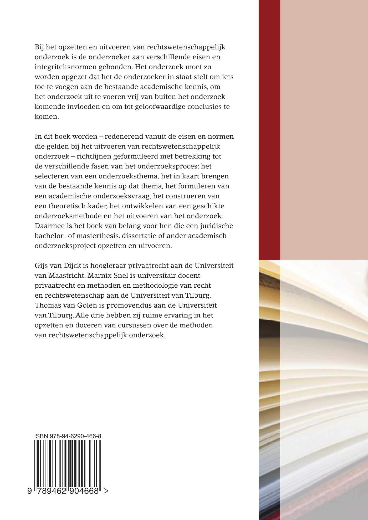 In dit boek worden – redenerend vanuit de eisen en normen die gelden bij het uitvoeren van rechtswetenschappelijk onderzoek – richtlijnen geformuleerd met betrekking tot de verschillende fasen van het onderzoeksproces: het selecteren van een onderzoeksthema, het in kaart brengen van de bestaande kennis op dat thema, het formuleren van een academische onderzoeksvraag, het construeren van een theoretisch kader, het ontwikkelen van een geschikte onderzoeksmethode en het uitvoeren van het onderzoek. Daarmee is het boek van belang voor hen die een juridische bachelor- of masterthesis, dissertatie of ander academisch onderzoeksproject opzetten en uitvoeren.
