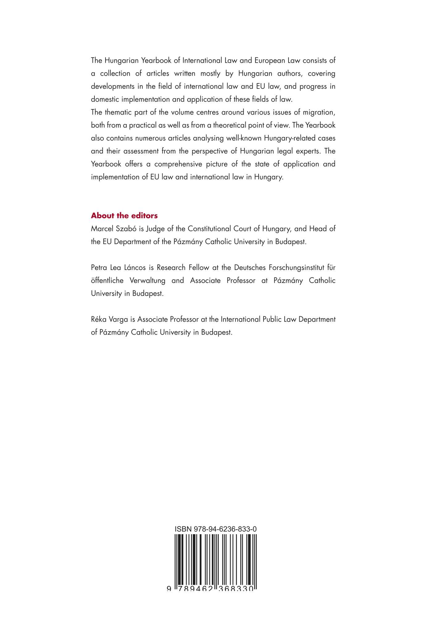 The Hungarian Yearbook of International Law and European Law consists of a collection of articles written mostly by Hungarian authors, covering developments in the field of international law and EU law, and progress in domestic implementation and application of these fields of law. The thematic part of the volume centres around various issues of migration, both from a practical as well as from a theoretical point of view. The Yearbook also contains numerous articles analysing well-known Hungary-related cases and their assessment from the perspective of Hungarian legal experts. The Yearbook offers a comprehensive picture of the state of application and implementation of EU law and international law in Hungary.