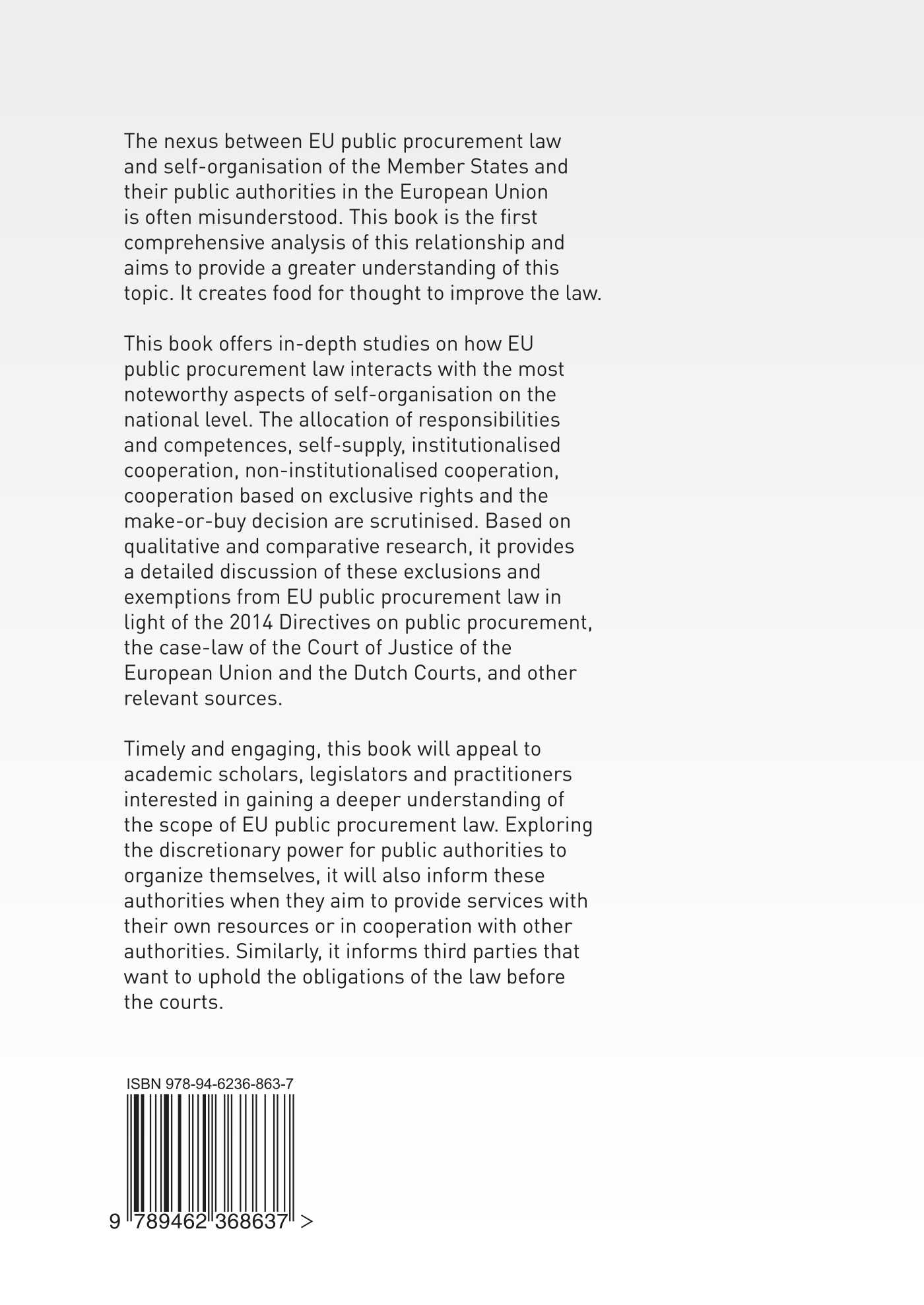 The nexus between EU public procurement law and self-organisation of the Member States and their public authorities in the European Union is often misunderstood. This book is the fi rst comprehensive analysis of this relationship and aims to provide a greater understanding of this topic. It creates food for thought to improve the law.