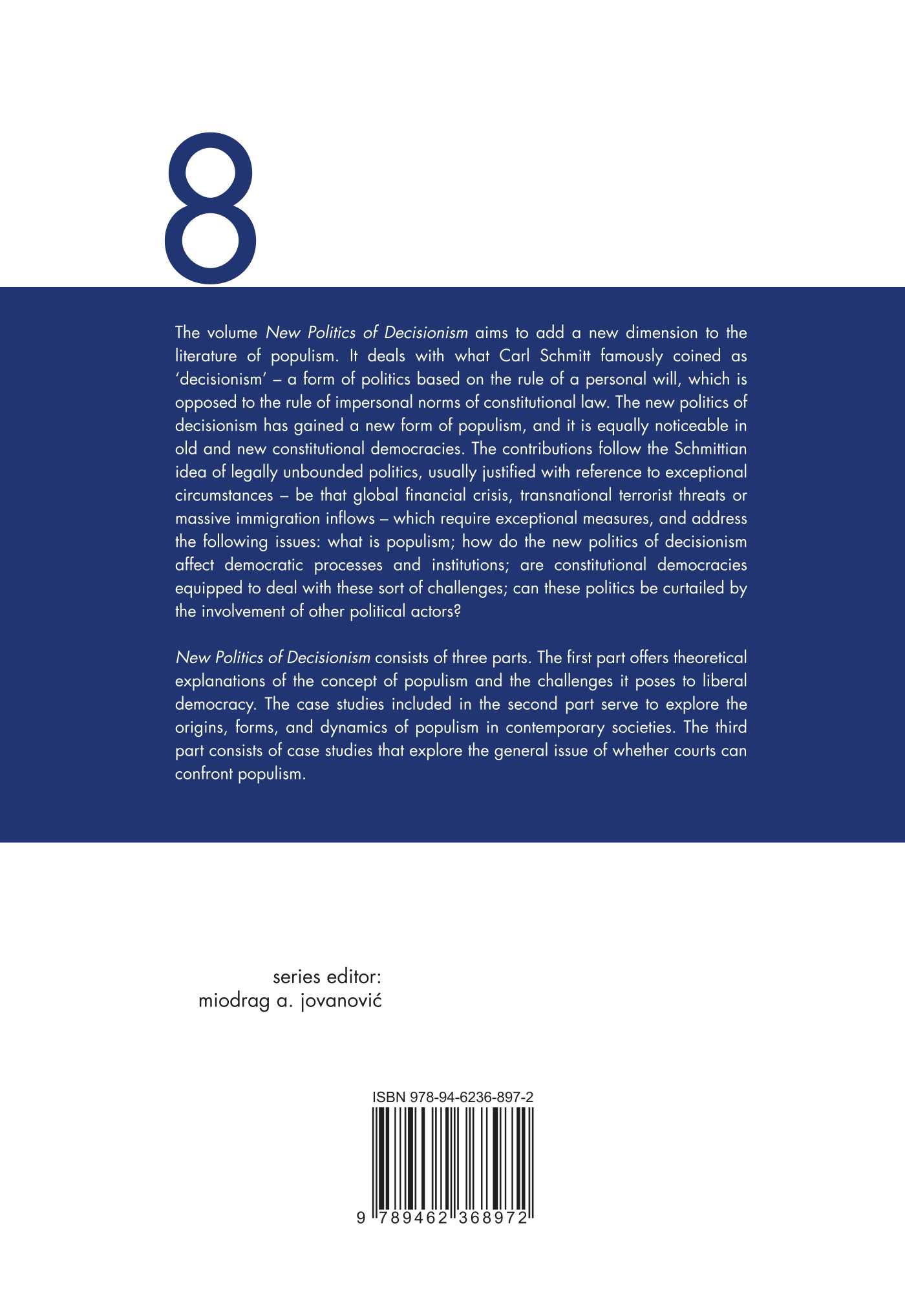 The volume New Politics of Decisionism aims to add a new dimension to the literature of populism. It deals with what Carl Schmitt famously coined as ‘decisionism’ – a form of politics based on the rule of a personal will, which is opposed to the rule of impersonal norms of constitutional law. The new politics of decisionism has gained a new form of populism, and it is equally noticeable in old and new constitutional democracies. The contributions follow the Schmittian idea of legally unbounded politics, usually justified with reference to exceptional circumstances – be that global financial crisis, transnational terrorist threats or massive immigration inflows – which require exceptional measures, and address the following issues: what is populism; how do the new politics of decisionism affect democratic processes and institutions; are constitutional democracies equipped to deal with these sort of challenges; can these politics be curtailed by the involvement of other political actors?