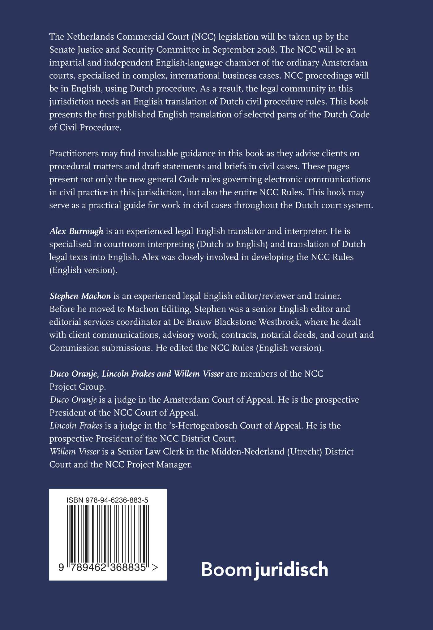 The Netherlands Commercial Court (NCC) legislation will be taken up by the Senate Justice and Security Committee in September 2018. The NCC will be an impartial and independent English-language chamber of the ordinary Amsterdam courts, specialised in complex, international business cases. NCC proceedings will be in English, using Dutch procedure. As a result, the legal community in this jurisdiction needs an English translation of Dutch civil procedure rules. This book presents the first published English translation of selected parts of the Dutch Code of Civil Procedure.