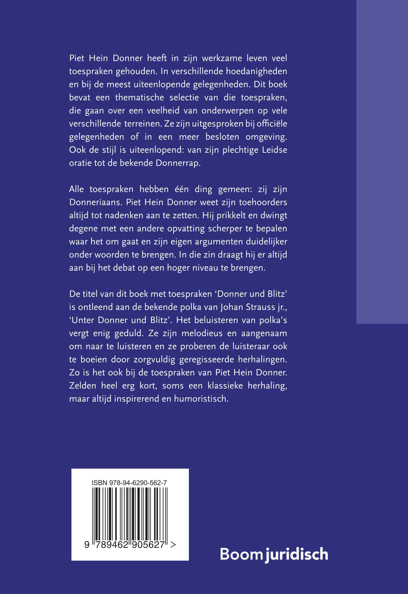 De titel van dit boek met toespraken ‘Donner und Blitz’ is ontleend aan de bekende polka van Johan Strauss jr., ‘Unter Donner und Blitz’. Het beluisteren van polka’s vergt enig geduld. Ze zijn melodieus en aangenaam om naar te luisteren en ze proberen de luisteraar ook te boeien door zorgvuldig geregisseerde herhalingen. Zo is het ook bij de toespraken van Piet Hein Donner. Zelden heel erg kort, soms een klassieke herhaling, maar altijd inspirerend en humoristisch.