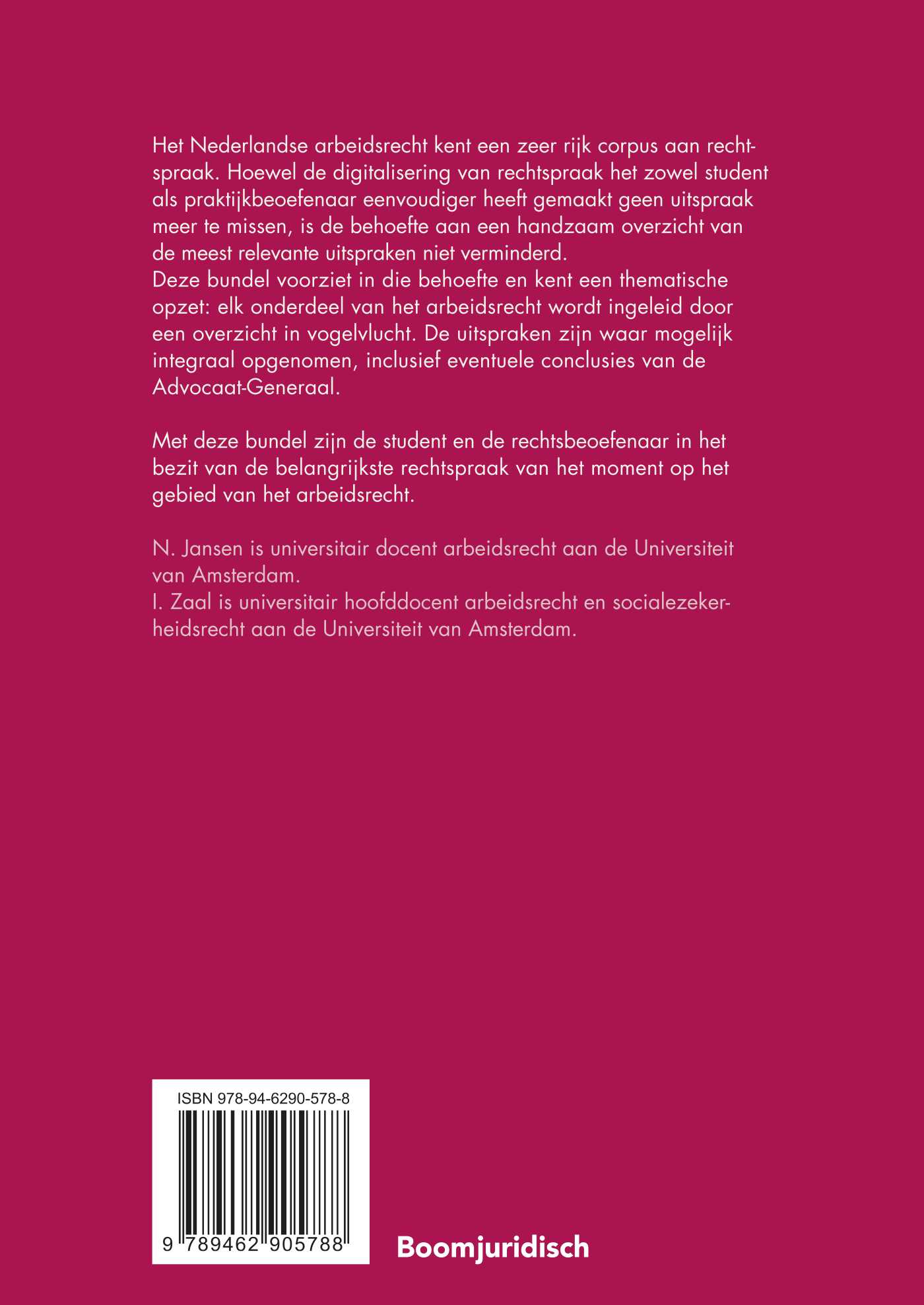 Het Nederlandse arbeidsrecht kent een zeer rijk corpus aan rechtspraak. Hoewel de digitalisering van rechtspraak het zowel student als praktijkbeoefenaar eenvoudiger heeft gemaakt geen uitspraak meer te missen, is de behoefte aan een handzaam overzicht van de meest relevante uitspraken niet verminderd. Deze bundel voorziet in die behoefte en kent een thematische opzet: elk onderdeel van het arbeidsrecht wordt ingeleid door een overzicht in vogelvlucht. De uitspraken zijn alle integraal opgenomen, inclusief eventuele conclusies van de Advocaat-Generaal.