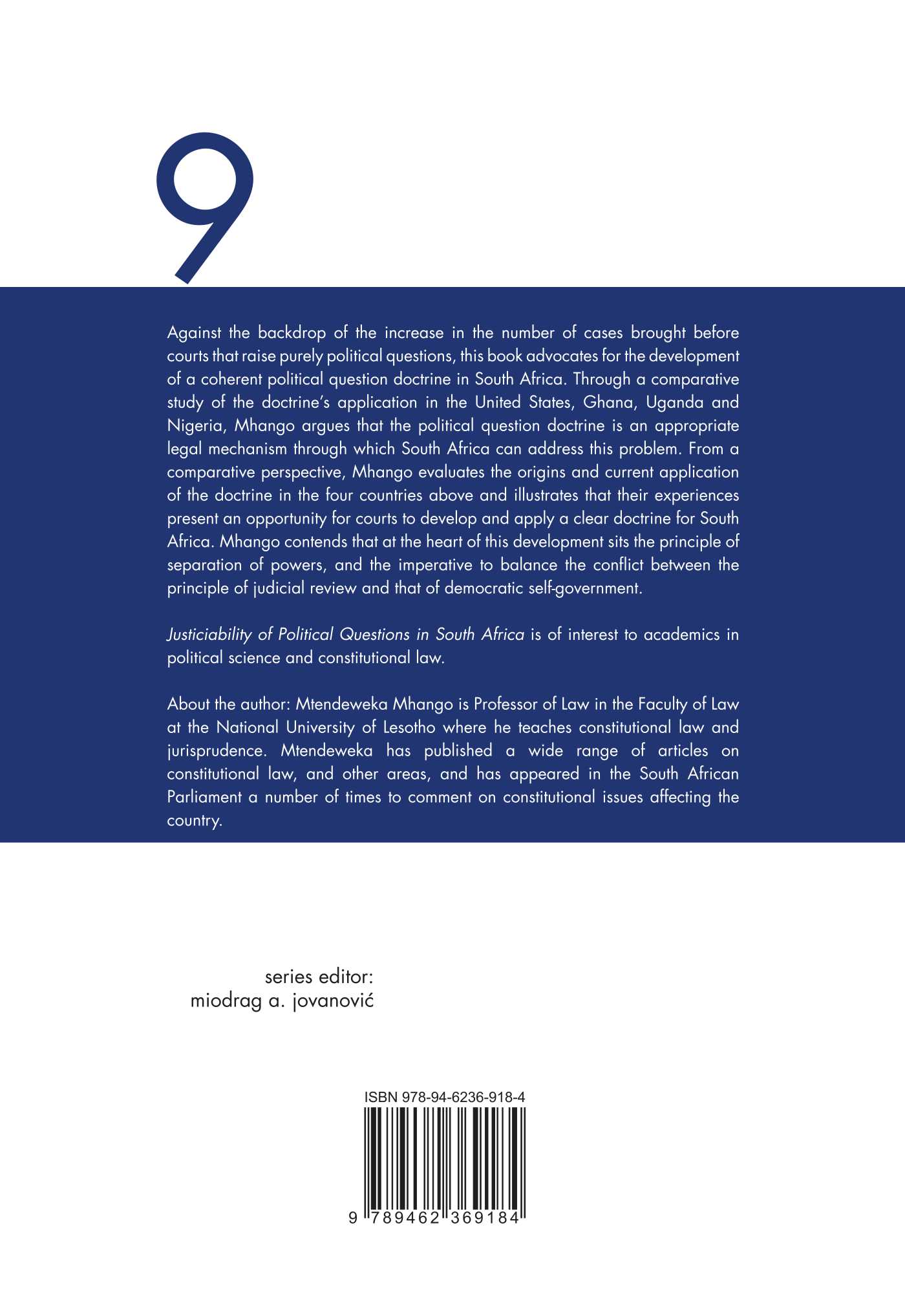 Against the backdrop of the increase in the number of cases brought before courts that raise purely political questions, this book advocates for the development of a coherent political question doctrine in South Africa. Through a comparative study of the doctrine’s application in the United States, Ghana, Uganda and Nigeria, Mhango argues that the political question doctrine is an appropriate legal mechanism through which South Africa can address this problem. From a comparative perspective, Mhango evaluates the origins and current application of the doctrine in the four countries above and illustrates that their experiences present an opportunity for courts to develop and apply a clear doctrine for South Africa. Mhango contends that at the heart of this development sits the principle of separation of powers, and the imperative to balance the conflict between the principle of judicial review and that of democratic self-government.