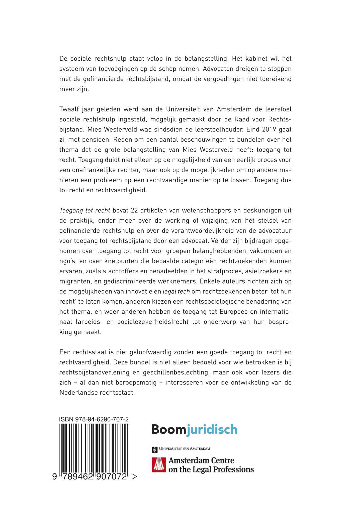 Twaalf jaar geleden werd aan de Universiteit van Amsterdam de leerstoel sociale rechtshulp ingesteld, mogelijk gemaakt door de Raad voor Rechtsbijstand. Mies Westerveld was sindsdien de leerstoelhouder. Eind 2019 gaat zij met pensioen. Reden om een aantal beschouwingen te bundelen over het thema dat de grote belangstelling van Mies Westerveld heeft: toegang tot recht. Toegang duidt niet alleen op de mogelijkheid van een eerlijk proces voor een onafhankelijke rechter, maar ook op de mogelijkheden om op andere manieren een probleem op een rechtvaardige manier op te lossen. Toegang dus tot recht en rechtvaardigheid.