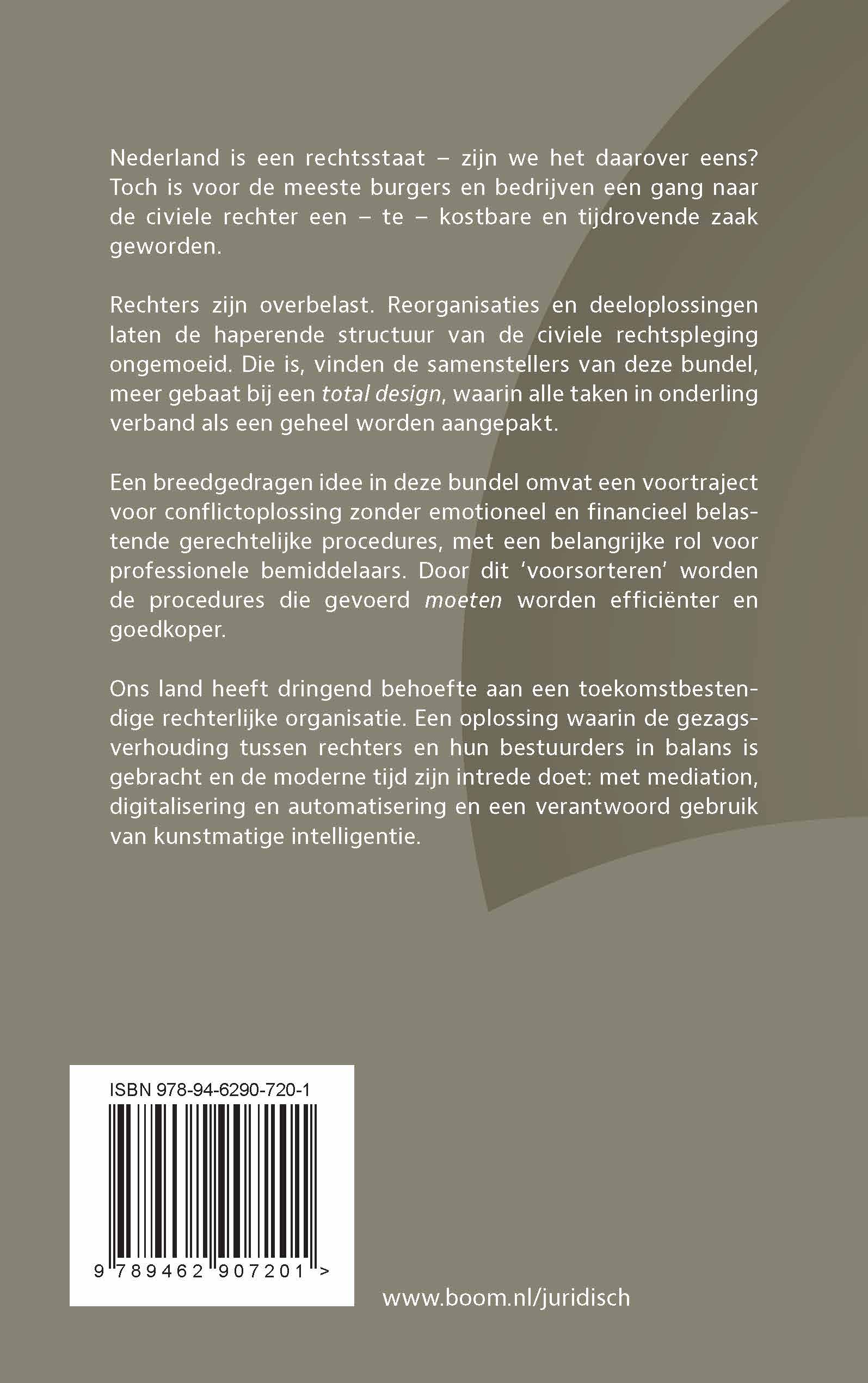 Rechters zijn overbelast. Reorganisaties en deeloplossingen laten de haperende structuur van de civiele rechtspleging ongemoeid. Die is, vinden de samenstellers van deze bundel, meer gebaat bij een total design, waarin alle taken in onderling verband als een geheel worden aangepakt.