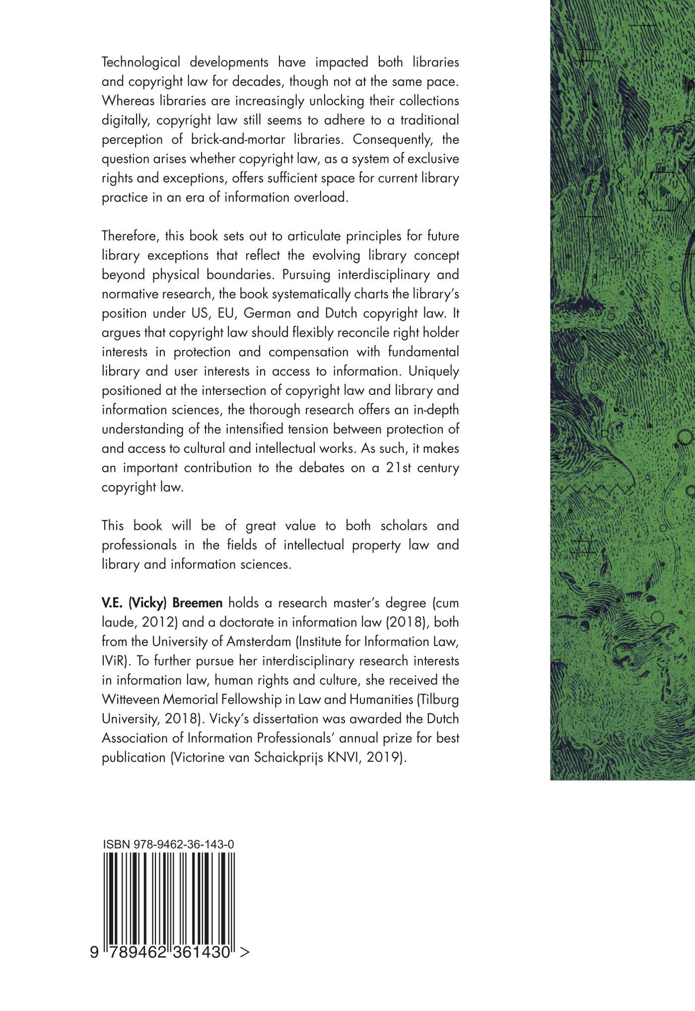 Therefore, this book sets out to articulate principles for future library exceptions that reflect the evolving library concept beyond physical boundaries. Pursuing interdisciplinary and normative research, the book systematically charts the library’s position under US, EU, German and Dutch copyright law. It argues that copyright law should flexibly reconcile right holder interests in protection and compensation with fundamental library and user interests in access to information. Uniquely positioned at the intersection of copyright law and library and information sciences, the thorough research offers an in-depth understanding of the intensified tension between protection of and access to cultural and intellectual works. As such, it makes an important contribution to the debates on a 21st century copyright law.