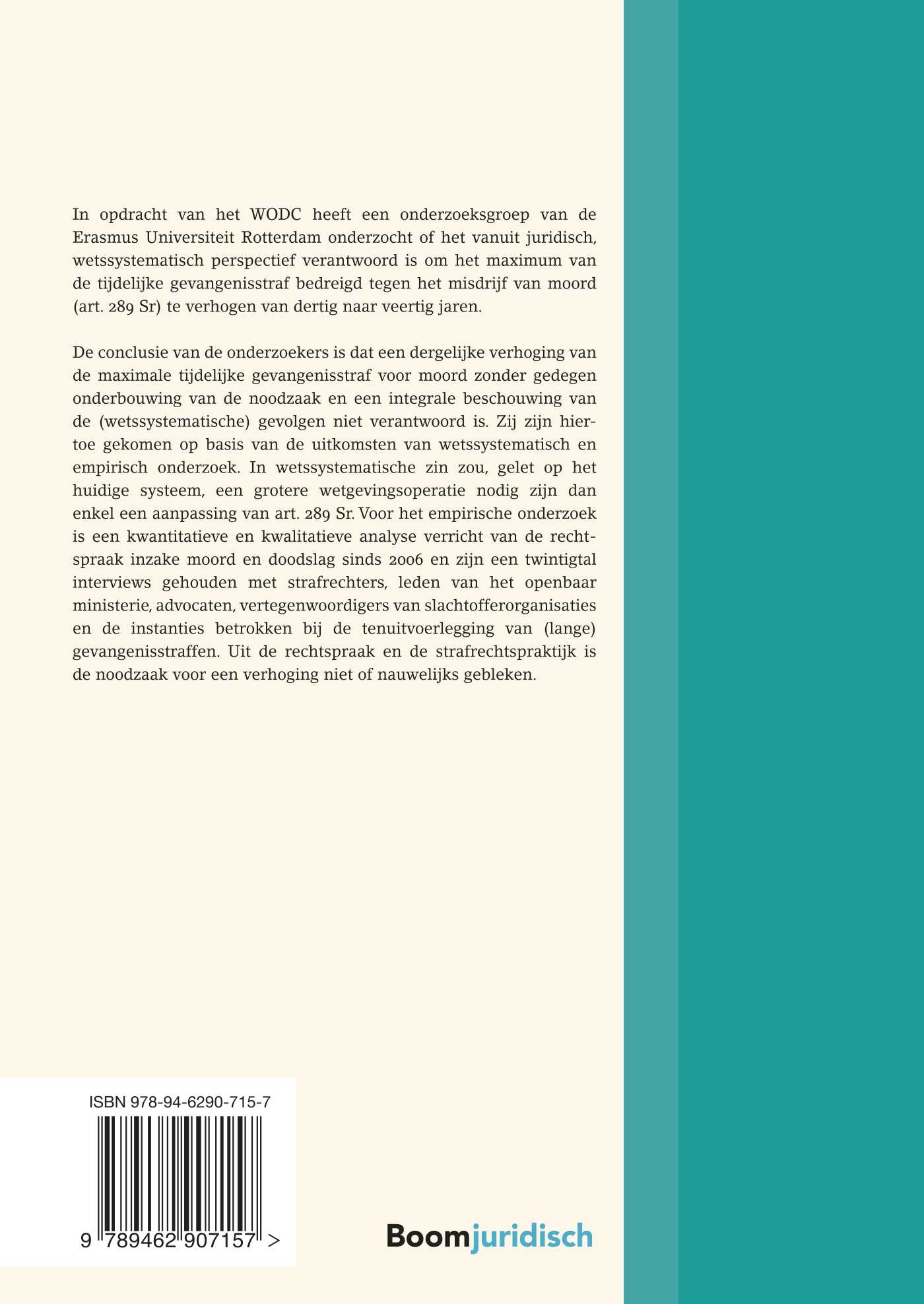 In opdracht van het WODC heeft een onderzoeksgroep van de Erasmus Universiteit Rotterdam onderzocht of het vanuit juridisch, wetssystematisch perspectief verantwoord is om het maximum van de tijdelijke gevangenisstraf bedreigd tegen het misdrijf van moord (art. 289 Sr) te verhogen van dertig naar veertig jaren.
