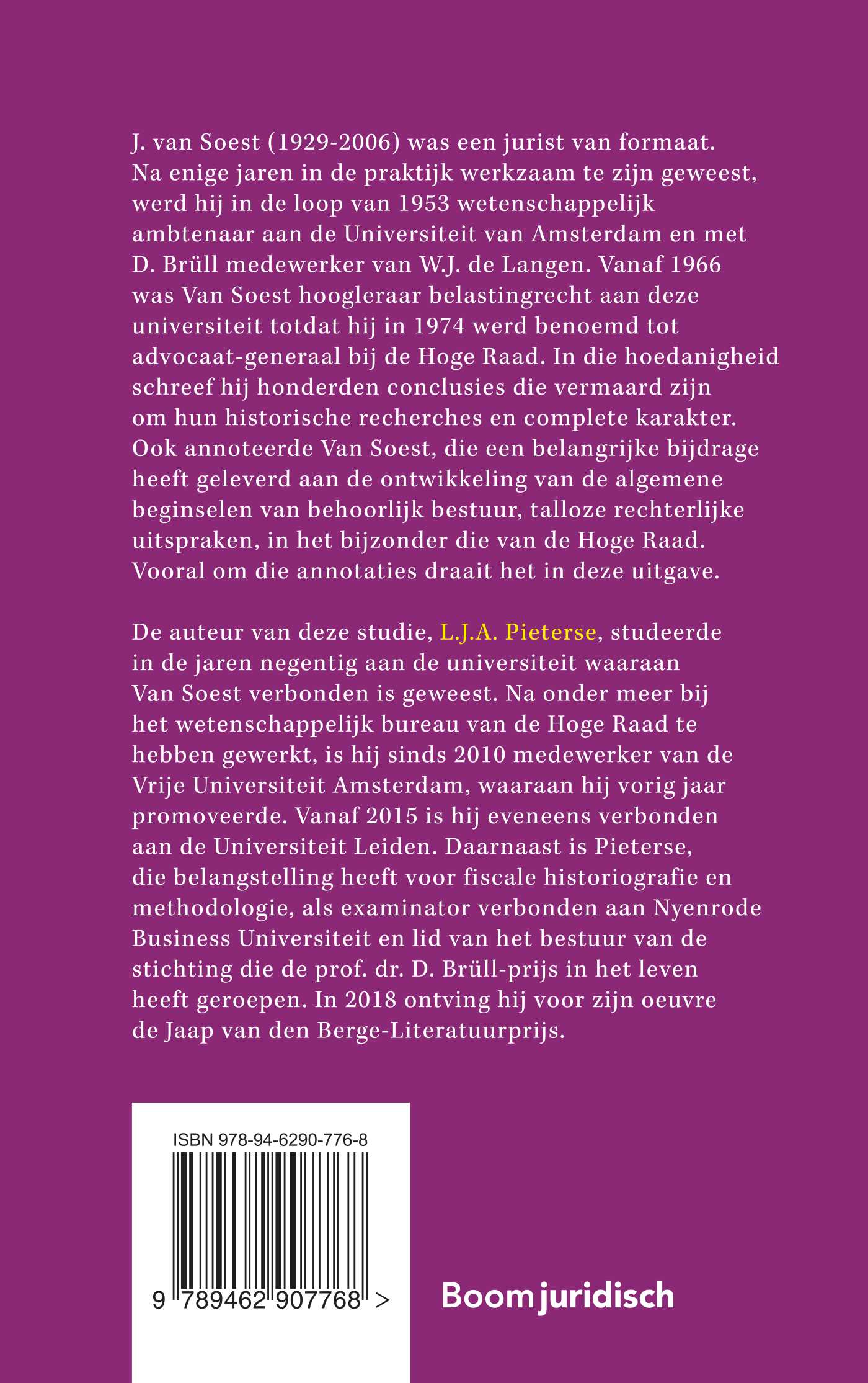 J. van Soest (1929-2006) was een jurist van formaat. Na enige jaren in de praktijk werkzaam te zijn geweest, werd hij in de loop van 1953 wetenschappelijk ambtenaar aan de Universiteit van Amsterdam en met D. Brüll medewerker van W.J. de Langen. Vanaf 1966 was Van Soest hoogleraar belastingrecht aan deze universiteit totdat hij in 1974 werd benoemd tot advocaat-generaal bij de Hoge Raad. In die hoedanigheid schreef hij honderden conclusies die vermaard zijn om hun historische recherches en complete karakter. Ook annoteerde Van Soest, die een belangrijke bijdrage heeft geleverd aan de ontwikkeling van de algemene beginselen van behoorlijk bestuur, talloze rechterlijke uitspraken, in het bijzonder die van de Hoge Raad. Vooral om die annotaties draait het in deze uitgave.
