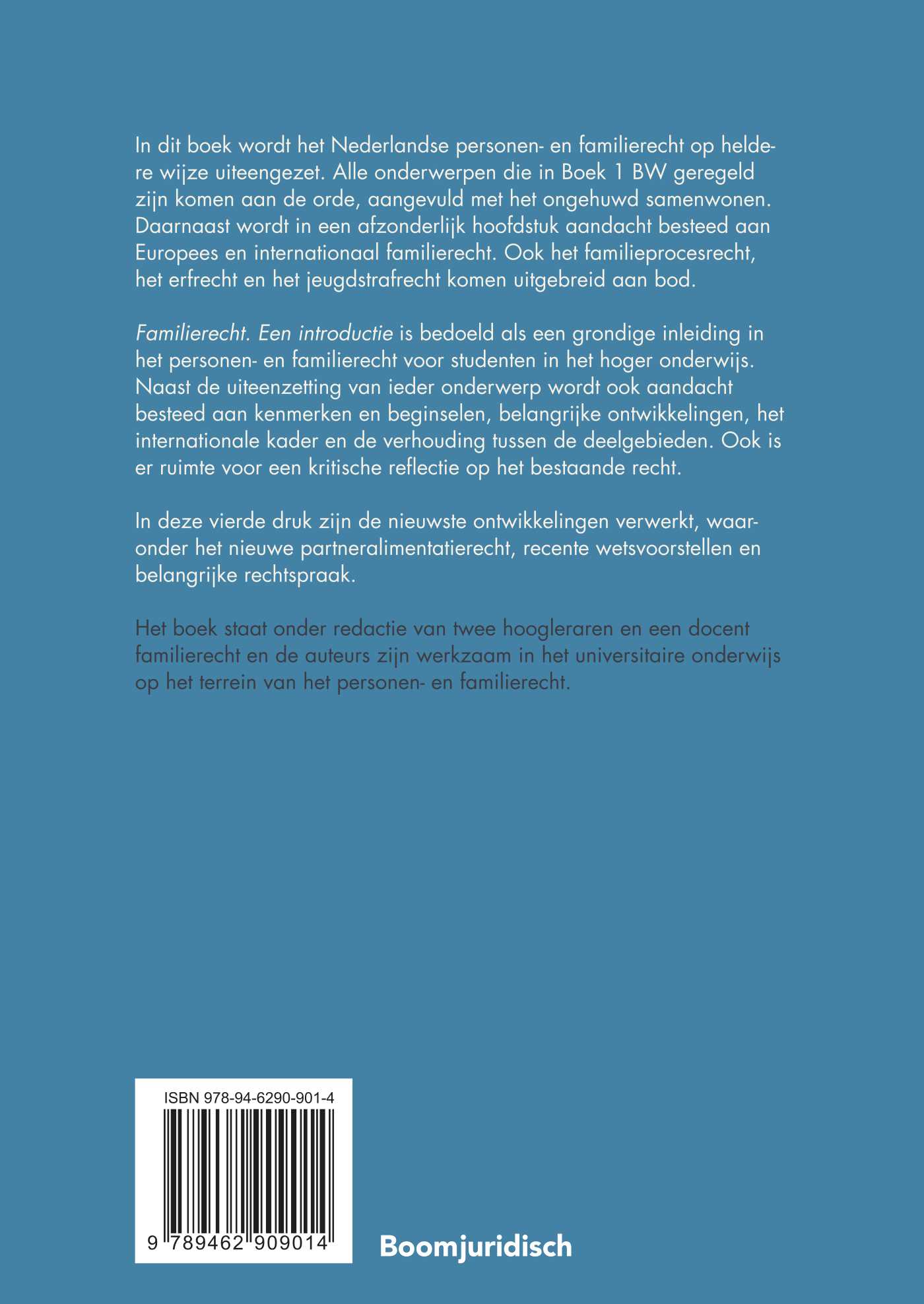 Familierecht. Een introductie is bedoeld als een grondige inleiding in het personen- en familierecht voor studenten in het hoger onderwijs. Naast de uiteenzetting van ieder onderwerp wordt ook aandacht besteed aan kenmerken en beginselen, belangrijke ontwikkelingen, het internationale kader en de verhouding tussen de deelgebieden. Ook is er ruimte voor een kritische reflectie op het bestaande recht.