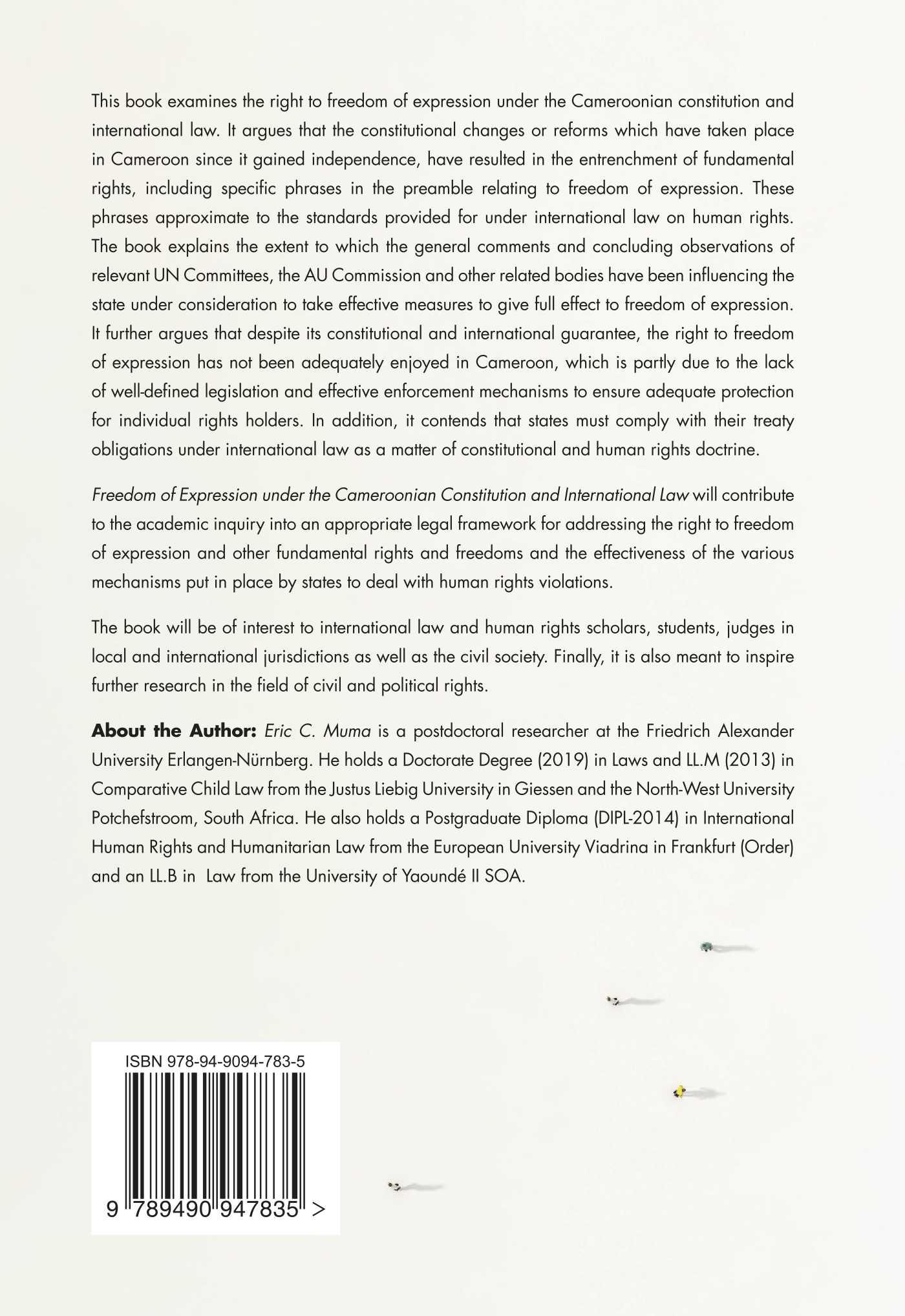 Freedom of Expression under the Cameroonian Constitution and International Law will contribute to the academic inquiry into an appropriate legal framework for addressing the right to freedom of expression and other fundamental rights and freedoms and the effectiveness of the various mechanisms put in place by states to deal with human rights violations.