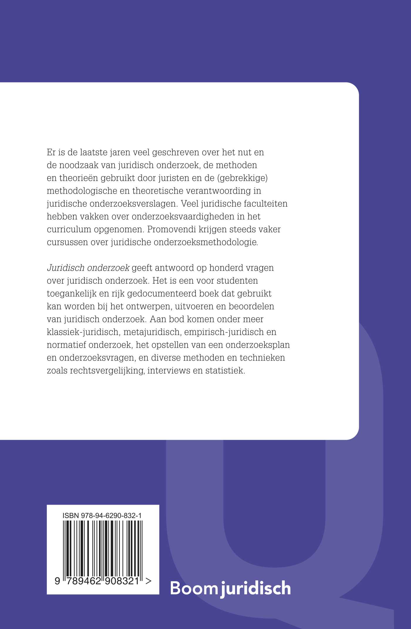 Juridisch onderzoek geeft antwoord op honderd vragen over juridisch onderzoek. Het is een voor studenten toegankelijk en rijk gedocumenteerd boek dat gebruikt kan worden bij het ontwerpen, uitvoeren en beoordelen van juridisch onderzoek. Aan bod komen onder meer klassiek-juridisch, metajuridisch, empirisch-juridisch en normatief onderzoek, het opstellen van een onderzoeksplan en onderzoeksvragen, en diverse methoden en technieken zoals rechtsvergelijking, interviews en statistiek.