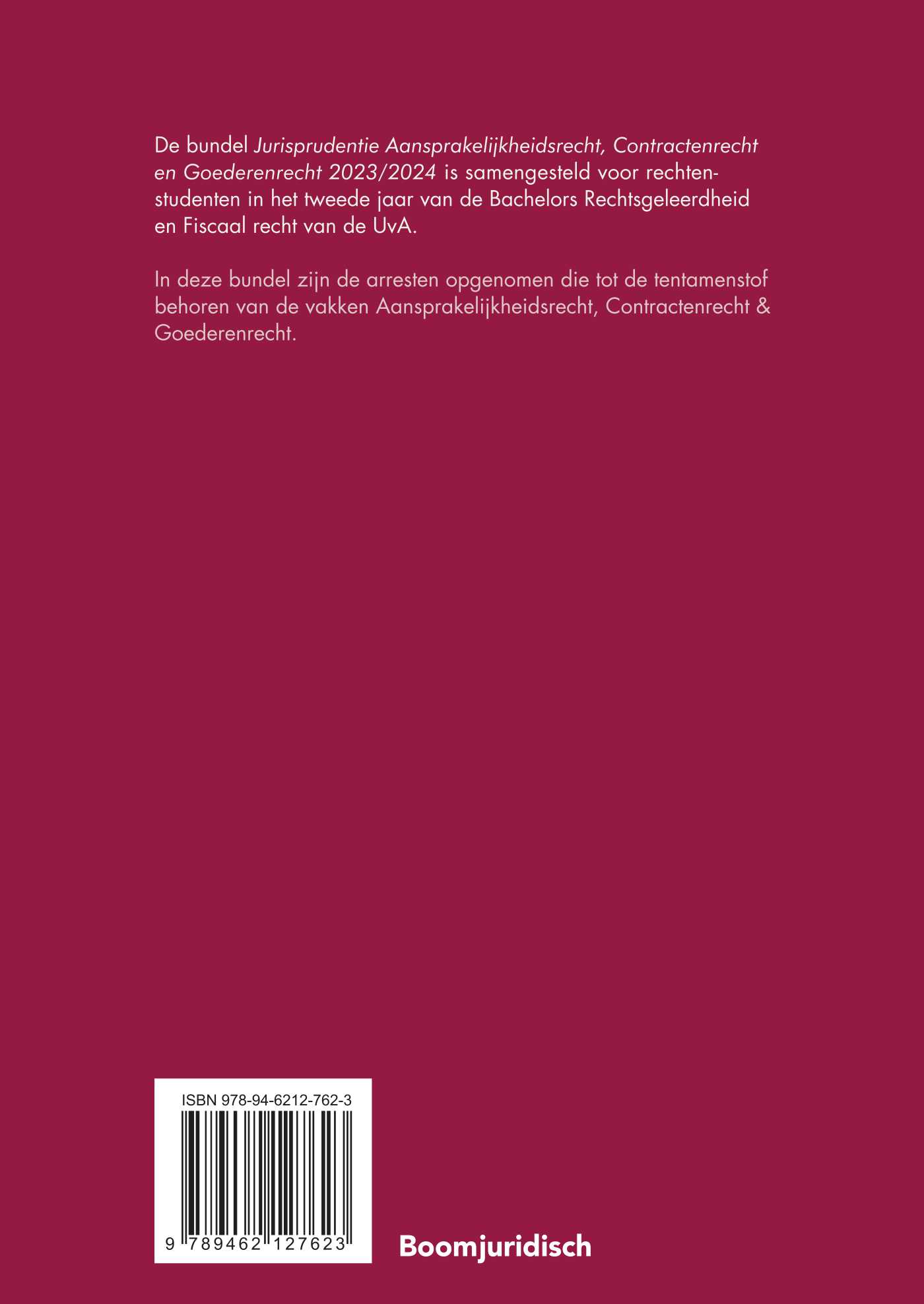 De bundel Jurisprudentie Aansprakelijkheidsrecht, Contractenrecht en Goederenrecht 2023/2024 is samengesteld voor rechtenstudenten in het tweede jaar van de Bachelors Rechtsgeleerdheid en Fiscaal recht van de UvA.