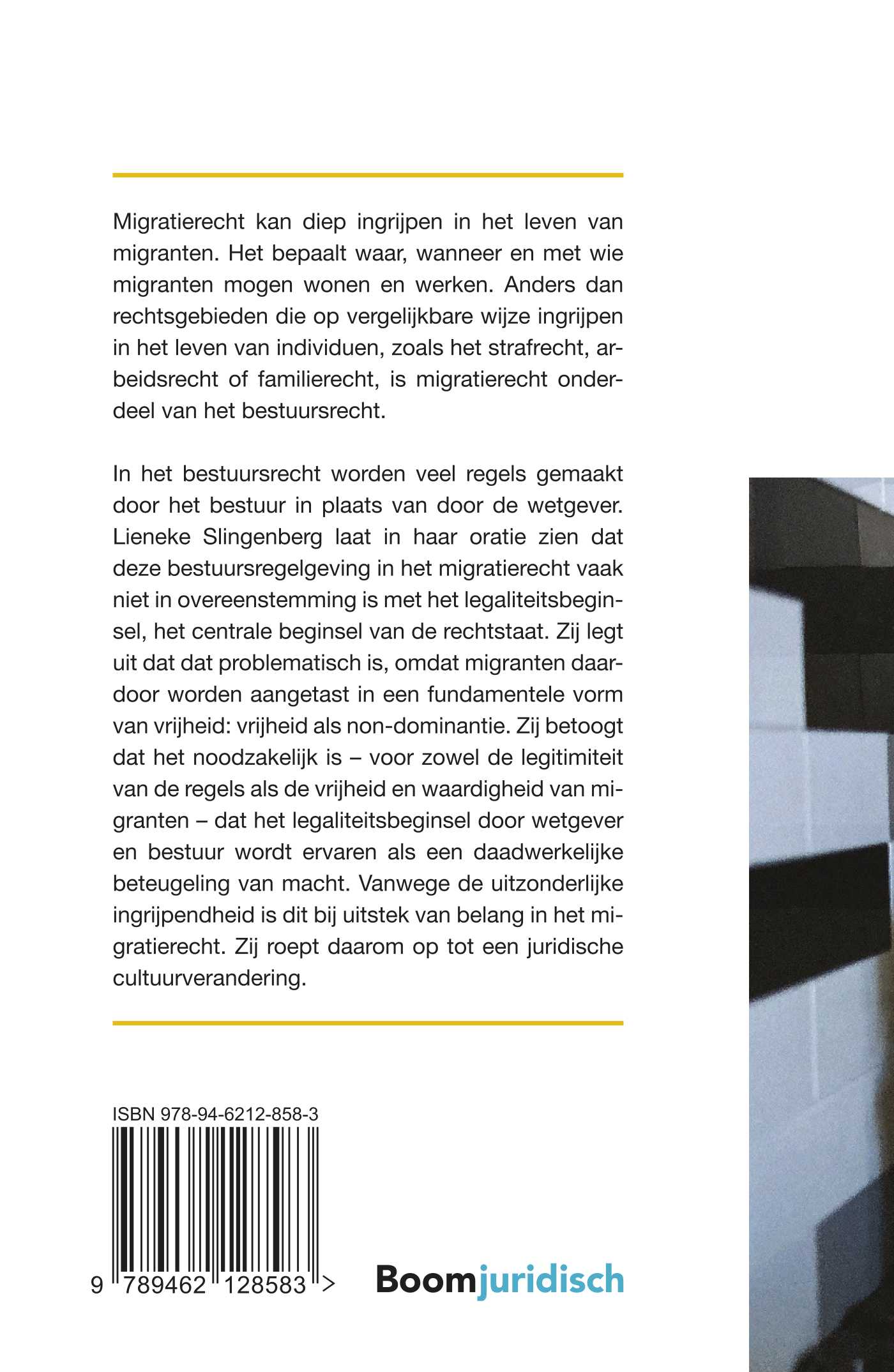 In het bestuursrecht worden veel regels gemaakt door het bestuur in plaats van door de wetgever. Lieneke Slingenberg laat in haar oratie zien dat deze bestuursregelgeving in het migratierecht vaak niet in overeenstemming is met het legaliteitsbeginsel, het centrale beginsel van de rechtstaat. Zij legt uit dat dat problematisch is, omdat migranten daardoor worden aangetast in een fundamentele vorm van vrijheid: vrijheid als non-dominantie. Zij betoogt dat het noodzakelijk is – voor zowel de legitimiteit van de regels als de vrijheid en waardigheid van migranten – dat het legaliteitsbeginsel door wetgever en bestuur wordt ervaren als een daadwerkelijke beteugeling van macht. Vanwege de uitzonderlijke ingrijpendheid is dit bij uitstek van belang in het migratierecht. Zij roept daarom op tot een juridische cultuurverandering.