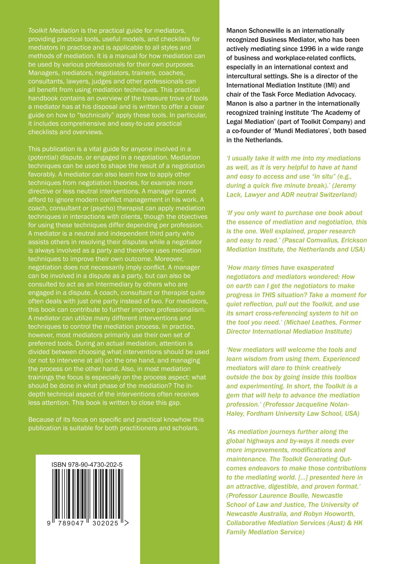 Toolkit Mediation is the practical guide for mediators, providing practical tools, useful models, and checklists for mediators in practice and is applicable to all styles and methods of mediation.It is a manual for how mediation can be used by various professionals for their own purposes. Managers, mediators, negotiators, trainers, coaches, consultants, lawyers, judges and other professionals can all benefit from using mediation techniques.