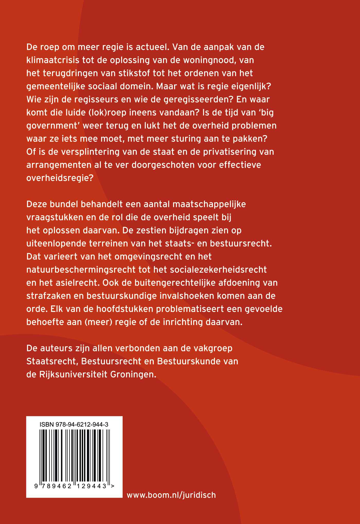 Deze bundel behandelt een aantal maatschappelijke vraagstukken en de rol die de overheid speelt bij het oplossen daarvan. De zestien bijdragen zien op uiteenlopende terreinen van het staats- en bestuursrecht. Dat varieert van het omgevingsrecht en het natuurbeschermingsrecht tot het socialezekerheidsrecht en het asielrecht. Ook de buitengerechtelijke afdoening van strafzaken en bestuurskundige invalshoeken komen aan de orde. Elk van de hoofdstukken problematiseert een gevoelde behoefte aan (meer) regie of de inrichting daarvan.