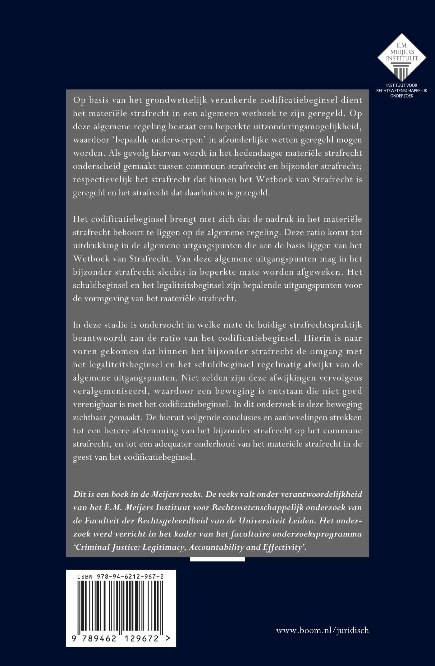 In deze studie is onderzocht in welke mate de huidige strafrechtspraktijk beantwoordt aan de ratio van het codificatiebeginsel. Hierin is naar voren gekomen dat binnen het bijzonder strafrecht de omgang met het legaliteitsbeginsel en het schuldbeginsel regelmatig afwijkt van de algemene uitgangspunten. Niet zelden zijn deze afwijkingen vervolgens veralgemeniseerd, waardoor een beweging is ontstaan die niet goed verenigbaar is met het codificatiebeginsel. In dit onderzoek is deze beweging zichtbaar gemaakt. De hieruit volgende conclusies en aanbevelingen strekken tot een betere afstemming van het bijzonder strafrecht op het commune strafrecht, en tot een adequater onderhoud van het materiële strafrecht in de geest van het codificatiebeginsel.
