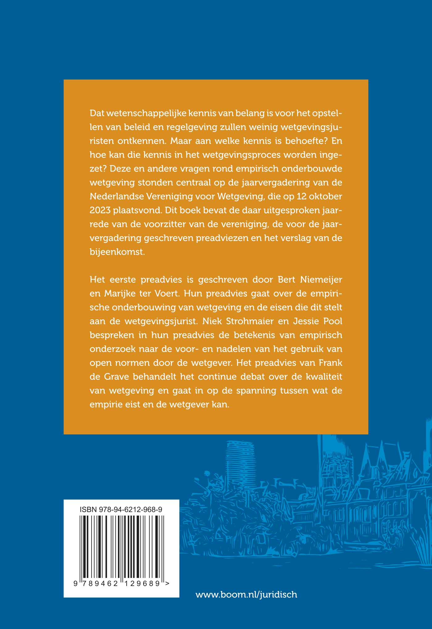 Dat wetenschappelijke kennis van belang is voor het opstellen van beleid en regelgeving zullen weinig wetgevingsjuristen ontkennen. Maar aan welke kennis is behoefte? En hoe kan die kennis in het wetgevingsproces worden ingezet? Deze en andere vragen rond empirisch onderbouwde wetgeving stonden centraal op de jaarvergadering van de Nederlandse Vereniging voor Wetgeving, die op 12 oktober 2023 plaatsvond. Dit boek bevat de daar uitgesproken jaarrede van de voorzitter van de vereniging, de voor de jaarvergadering geschreven preadviezen en het verslag van de bijeenkomst.